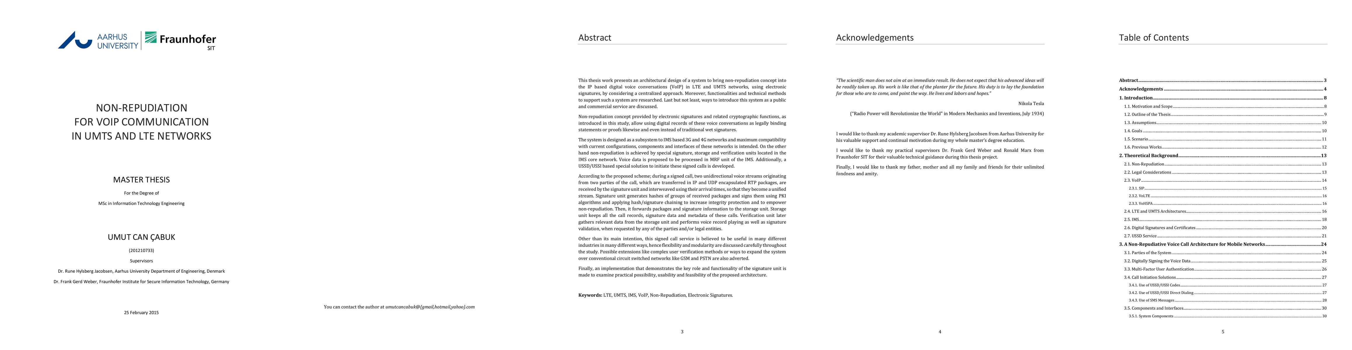 This thesis work presents an architectural design of a system to bring non-repudiation concept into the IP based digital voice conversations (VoIP) in LTE and UMTS networks, using electronic signatures, by considering a centralized approach. Moreover, functionalities and technical methods to support such a system are researched. Last but not least, ways to introduce this system as a public and commercial service are discussed. Non-repudiation concept provided by electronic signatures and related cryptographic functions, as introduced in this study, allow using digital records of these voice conversations as legally binding statements or proofs likewise and even instead of traditional wet signatures. The system is designed as a subsystem to IMS based 3G and 4G networks and maximum compatibility with current configurations, components and interfaces of these networks is intended. On the other hand non-repudiation is achieved by special signature, storage and verification units located in the IMS core network. Voice data is proposed to be processed in MRF unit of the IMS. Additionally, a USSD/USSI based special solution to initiate these signed calls is developed. According to the proposed scheme; during a signed call, two unidirectional voice streams originating from two parties of the call, which are transferred in IP and UDP encapsulated RTP packages, are received by the signature unit and interweaved using their arrival times, so that they become a unified stream. Signature unit generates hashes of groups of received packages and signs them using PKI algorithms and applying hash/signature chaining to increase integrity protection and to empower non-repudiation. Then, it forwards packages and signature information to the storage unit. Storage unit keeps all the call records, signature data and metadata of these calls. Verification unit later gathers relevant data from the storage unit...