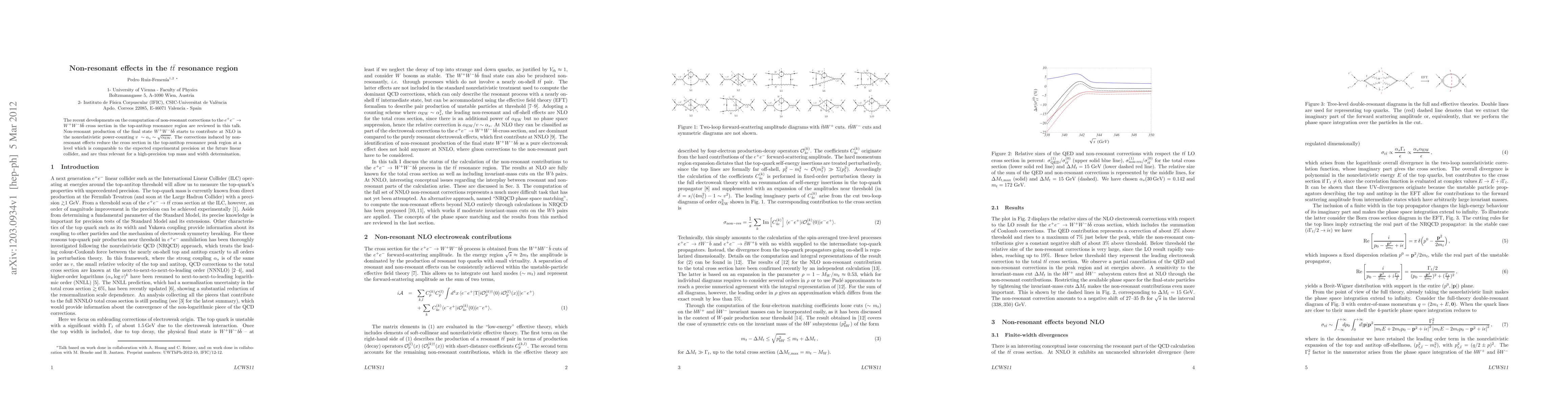 The recent developments on the computation of non-resonant corrections to the e+ e- -> W+ W- b bbar cross section in the top-antitop resonance region are reviewed in this talk. Non-resonant production of the final state W+ W- b bbar starts to contribute at NLO in the nonrelativistic power-counting v ~ alpha_s ~ sqrt(alpha_EW). The corrections induced by non-resonant effects reduce the cross section in the top-antitop resonance peak region at a level which is comparable to the expected experimental precision at the future linear collider, and are thus relevant for a high-precision top mass and width determination.