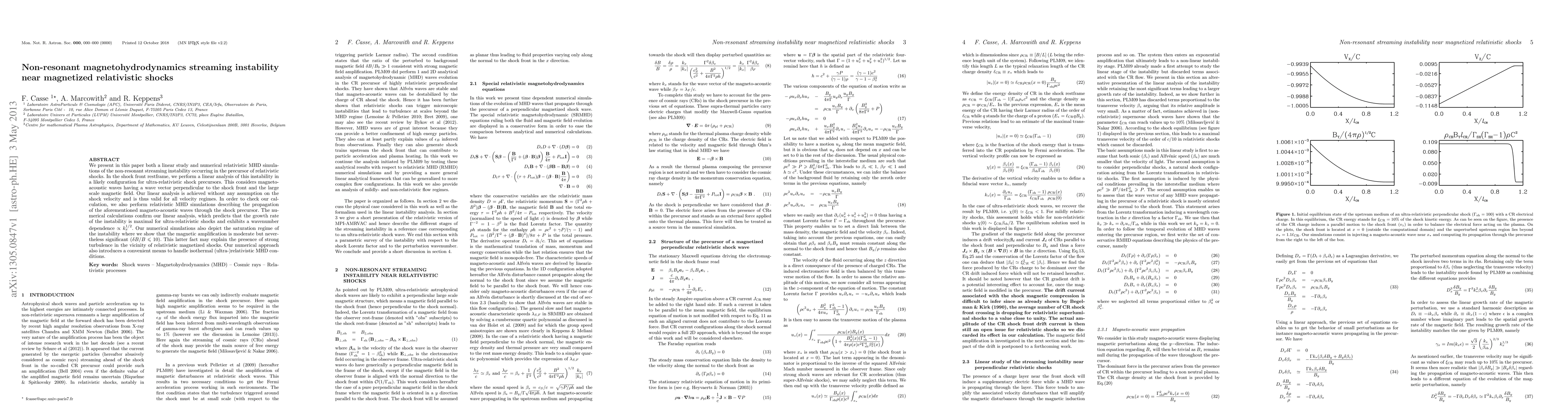We present in this paper both a linear study and numerical relativistic MHD simulations of the non-resonant streaming instability occurring in the precursor of relativistic shocks. In the shock front restframe, we perform a linear analysis of this instability in a likely configuration for ultra-relativistic shock precursors. This considers magneto-acoustic waves having a wave vector perpendicular to the shock front and the large scale magnetic field. Our linear analysis is achieved without any assumption on the shock velocity and is thus valid for all velocity regimes. In order to check our calculation, we also perform relativistic MHD simulations describing the propagation of the aforementioned magneto-acoustic waves through the shock precursor. The numerical calculations confirm our linear analysis, which predicts that the growth rate of the instability is maximal for ultra-relativistic shocks and exhibits a wavenumber dependence $\propto k_x^{1/2}$. Our numerical simulations also depict the saturation regime of the instability where we show that the magnetic amplification is moderate but nevertheless significant ($\delta B/B\leq 10$). This latter fact may explain the presence of strong turbulence in the vicinity of relativistic magnetized shocks. Our numerical approach also introduces a convenient means to handle isothermal (ultra-)relativistic MHD conditions.