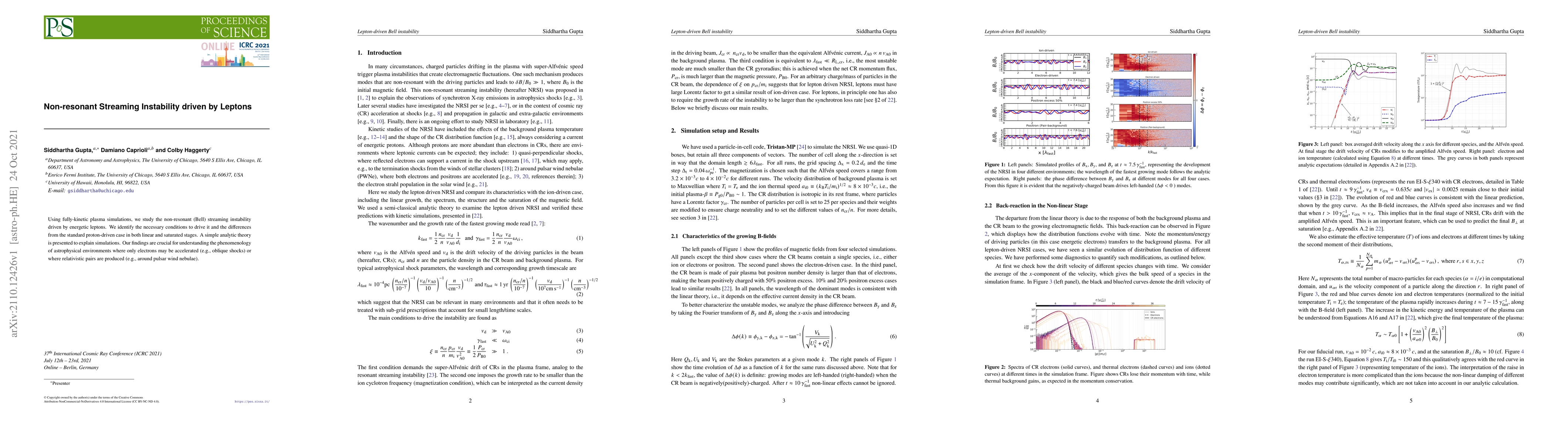 This paper investigates the non-resonant streaming instability driven by energetic leptons using kinetic plasma simulations, identifying conditions and differences from proton-driven cases. The study provides an analytic theory to explain the simulations, crucial for understanding astrophysical environments with significant electron acceleration.