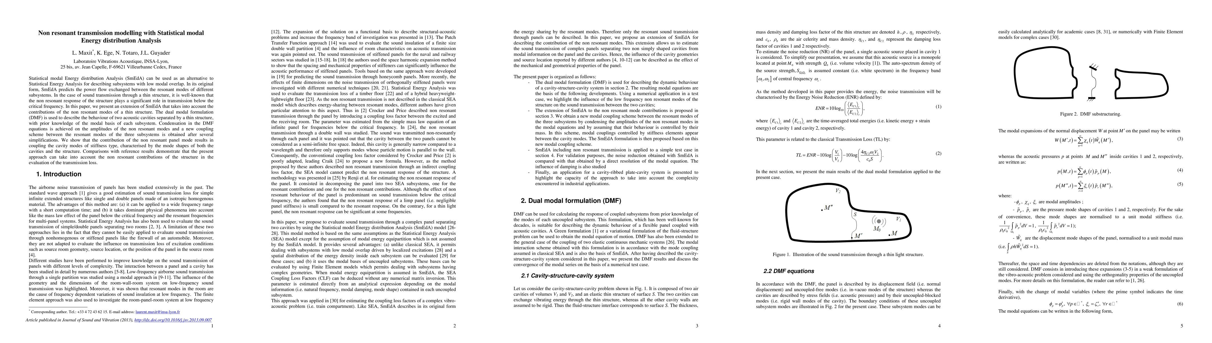 Statistical modal Energy distribution Analysis (SmEdA) can be used as an alternative to Statistical Energy Analysis for describing subsystems with low modal overlap. In its original form, SmEdA predicts the power flow exchanged between the resonant modes of different subsystems. In the case of sound transmission through a thin structure, it is well-known that the non resonant response of the structure plays a significant role in transmission below the critical frequency. In this paper, we present an extension of SmEdA that takes into account the contributions of the non resonant modes of a thin structure. The dual modal formulation (DMF) is used to describe the behaviour of two acoustic cavities separated by a thin structure, with prior knowledge of the modal basis of each subsystem. Condensation in the DMF equations is achieved on the amplitudes of the non resonant modes and a new coupling scheme between the resonant modes of the three subsystems is obtained after several simplifications. We show that the contribution of the non resonant panel mode results in coupling the cavity modes of stiffness type, characterised by the mode shapes of both the cavities and the structure. Comparisons with reference results demonstrate that the present approach can take into account the non resonant contributions of the structure in the evaluation of the transmission loss.