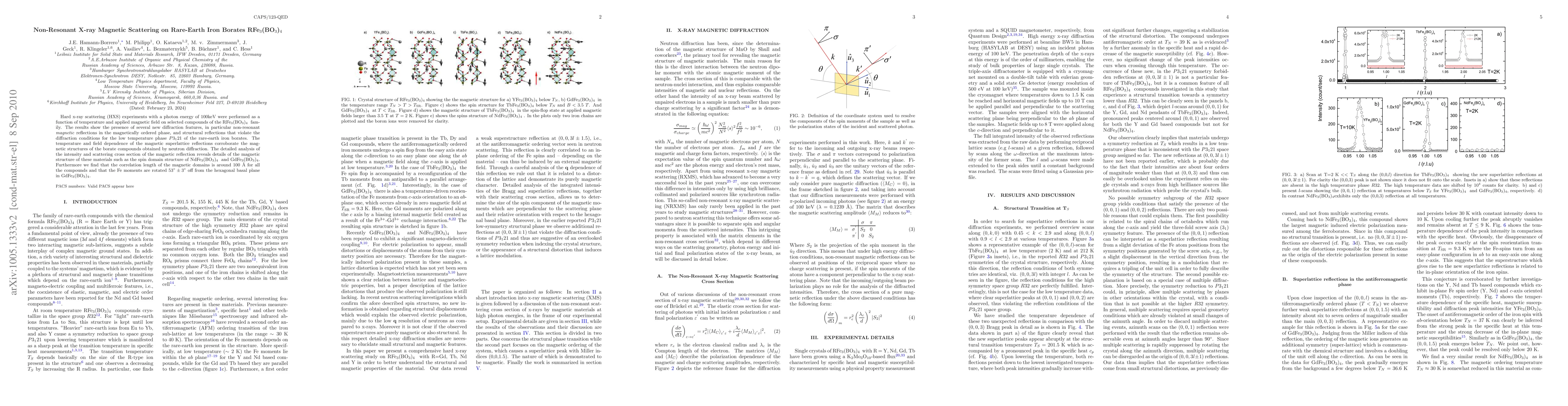 Hard x-ray scattering (HXS) experiments with a photon energy of 100keV were performed as a function of temperature and applied magnetic field on selected compounds of the RFe$_3$(BO$_3$)$_4$ family. The results show the presence of several unexpected diffraction features, in particular non-resonant magnetic reflections in the magnetically ordered phase, and structural reflections that violate the diffraction conditions for the low temperature phase $P3_121$ of the rare-earth iron borates. The temperature and field dependence of the magnetic superlattice reflections corroborate the magnetic structures of the borate compounds obtained by neutron diffraction. The detailed analysis of the intensity and scattering cross section of the magnetic reflection reveals details of the magnetic structure of these materials such as the spin domain structure of NdFe$_3$(BO$_3$)$_4$ and GdFe$_3$(BO$_3$)$_4$. Furthermore we find that the correlation length of the magnetic domains is around 100 \AA{} for all the compounds and that the Fe moments are rotated $53^\circ\pm3^\circ$ off from the hexagonal basal plane in GdFe$_3$(BO$_3$)$_4$