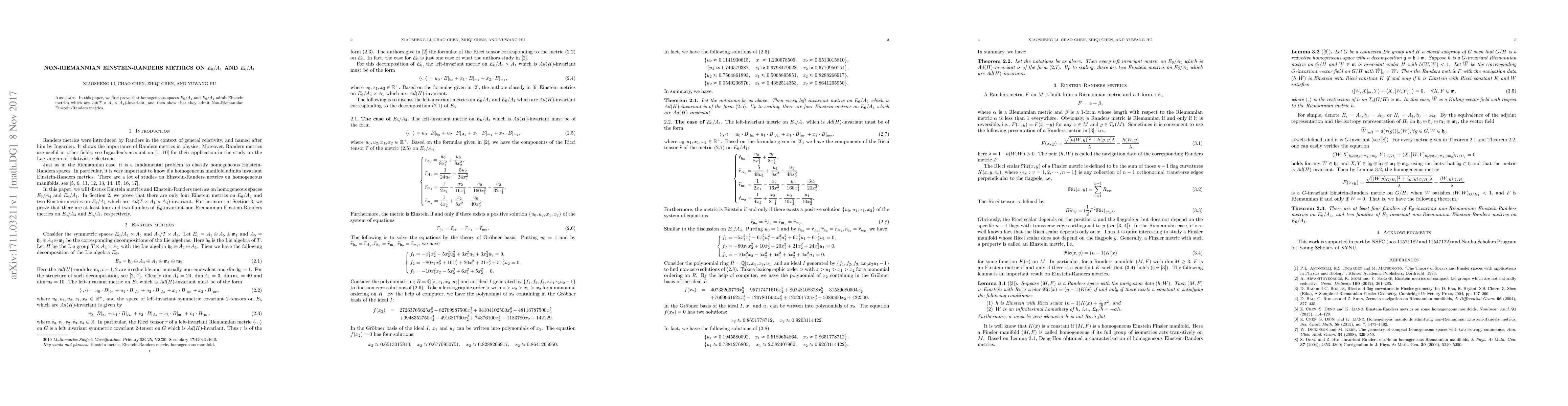This paper proves the existence of Einstein metrics on homogeneous spaces $E_6/A_4$ and $E_6/A_1$ invariant under specific transformations, and further demonstrates that these spaces also support non-Riemannian Einstein-Randers metrics.