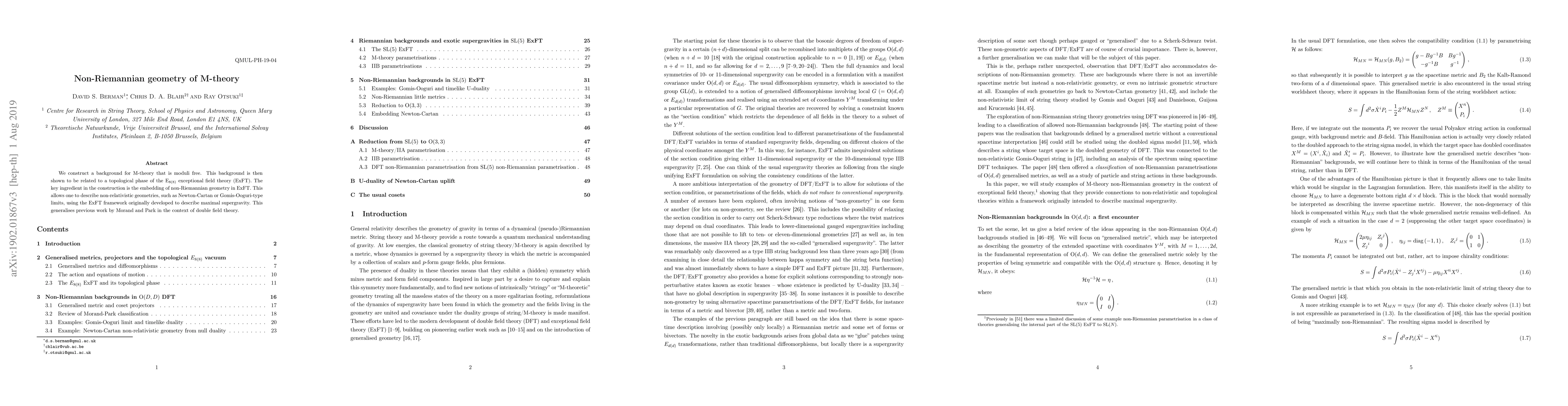 We construct a background for M-theory that is moduli free. This background is then shown to be related to a topological phase of the $\mathrm{E}_{8(8)}$ exceptional field theory (ExFT). The key ingredient in the construction is the embedding of non-Riemannian geometry in ExFT. This allows one to describe non-relativistic geometries, such as Newton-Cartan or Gomis-Ooguri-type limits, using the ExFT framework originally developed to describe maximal supergravity. This generalises previous work by Morand and Park in the context of double field theory.