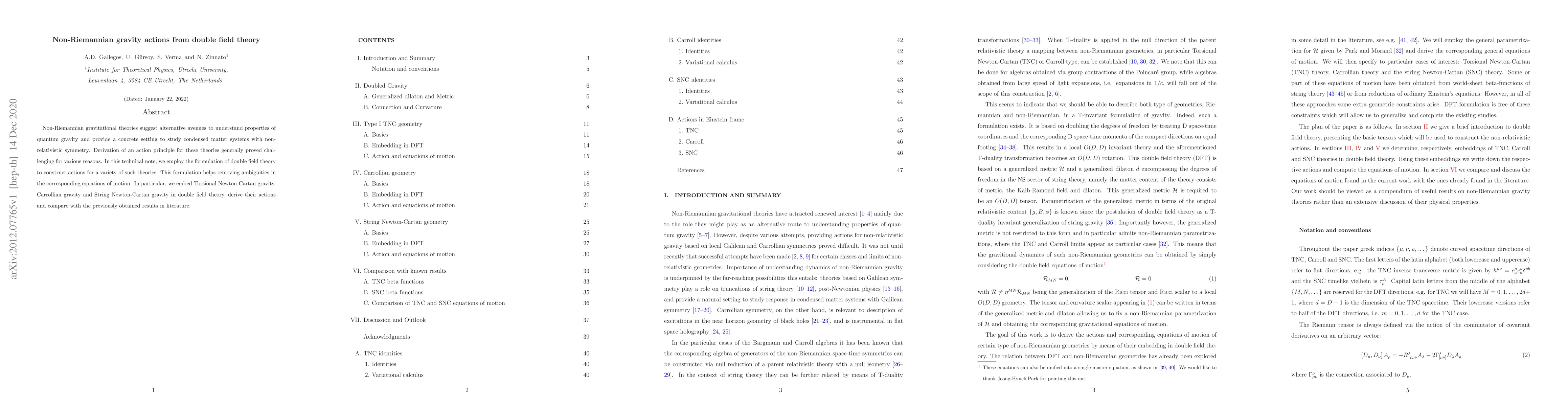 This paper utilizes double field theory to construct actions for non-Riemannian gravitational theories, including Torsional Newton-Cartan, Carrollian, and String Newton-Cartan gravities, resolving ambiguities in their equations of motion and comparing results with existing literature.