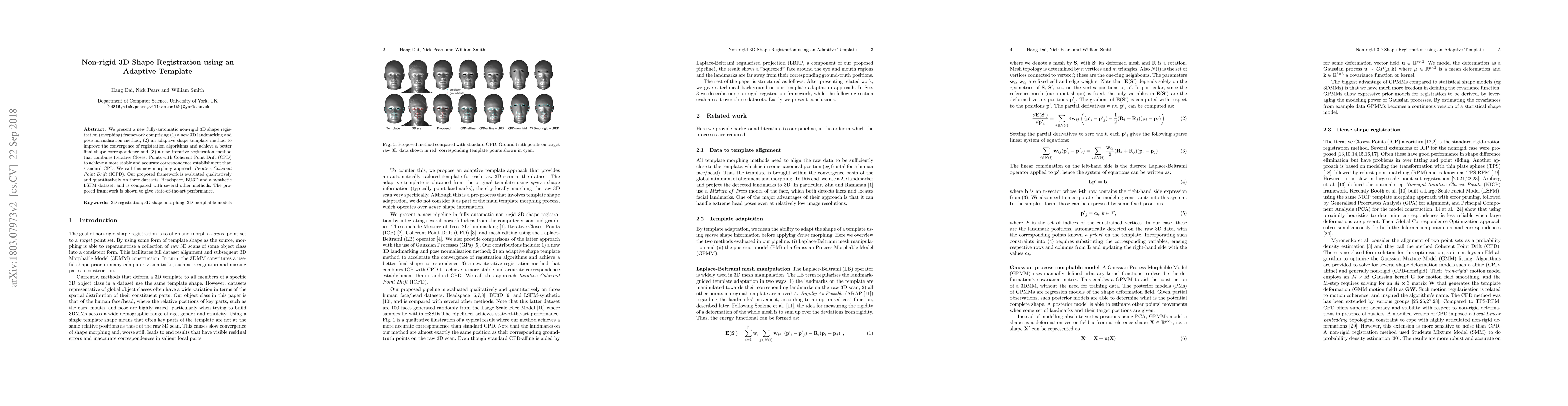 The research presents a fully-automatic non-rigid 3D shape registration framework with an adaptive template initialization. It includes a 3D landmarking and pose normalization method, an adaptive shape template method for faster convergence and better correspondence, and a new Iterative Coherent Point Drift (ICPD) method combining ICP and CPD for stable and accurate correspondence establishment.