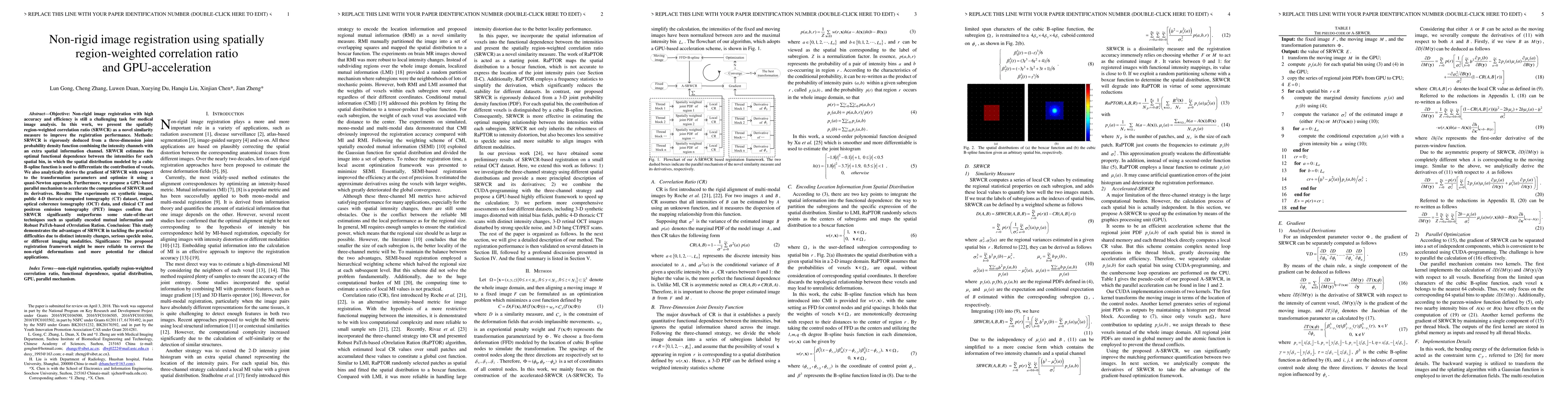 Objective: Non-rigid image registration with high accuracy and efficiency is still a challenging task for medical image analysis. In this work, we present the spatially region-weighted correlation ratio (SRWCR) as a novel similarity measure to improve the registration performance. Methods: SRWCR is rigorously deduced from a three-dimension joint probability density function combining the intensity channels with an extra spatial information channel. SRWCR estimates the optimal functional dependence between the intensities for each spatial bin, in which the spatial distribution modeled by a cubic B-spline function is used to differentiate the contribution of voxels. We also analytically derive the gradient of SRWCR with respect to the transformation parameters and optimize it using a quasi-Newton approach. Furthermore, we propose a GPU-based parallel mechanism to accelerate the computation of SRWCR and its derivatives. Results: The experiments on synthetic images, public 4-D thoracic computed tomography (CT) dataset, retinal optical coherence tomography (OCT) data, and clinical CT and positron emission tomography (PET) images confirm that SRWCR significantly outperforms some state-of-the-art techniques such as spatially encoded mutual information and Robust PaTch-based cOrrelation Ration. Conclusion: This study demonstrates the advantages of SRWCR in tackling the practical difficulties due to distinct intensity changes, serious speckle noise, or different imaging modalities. Significance: The proposed registration framework might be more reliable to correct the non-rigid deformations and more potential for clinical applications.