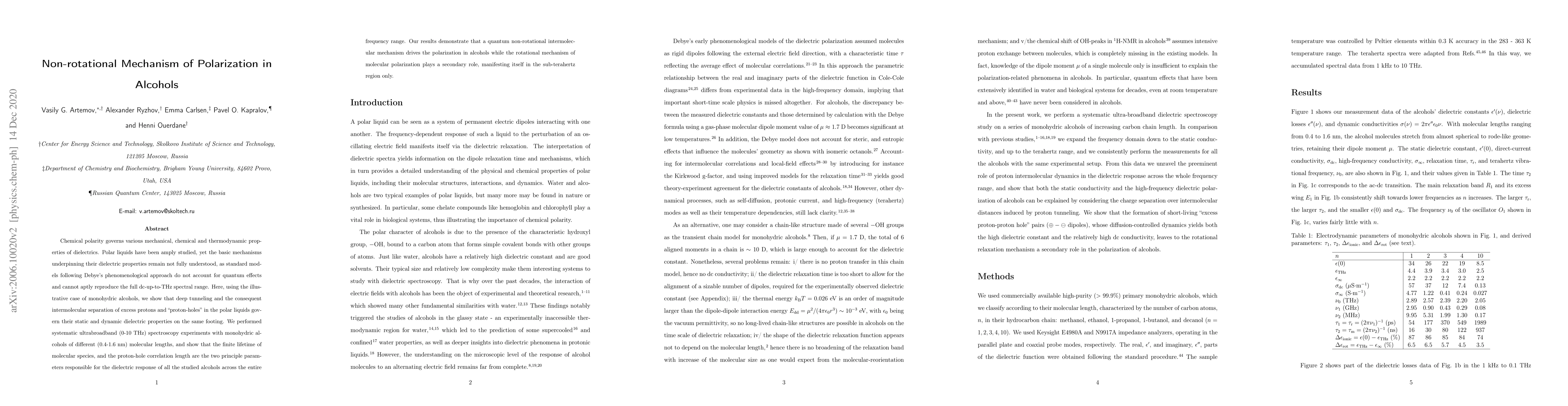 Chemical polarity governs various mechanical, chemical and thermodynamic properties of dielectrics. Polar liquids have been amply studied, yet the basic mechanisms underpinning their dielectric properties remain not fully understood, as standard models following Debye's phenomenological approach do not account for quantum effects and cannot aptly reproduce the full dc-up-to-THz spectral range. Here, using the illustrative case of monohydric alcohols, we show that deep tunneling and the consequent intermolecular separation of excess protons and "proton-holes" in the polar liquids govern their static and dynamic dielectric properties on the same footing. We performed systematic ultrabroadband (0-10 THz) spectroscopy experiments with monohydric alcohols of different (0.4-1.6 nm) molecular lengths, and show that the finite lifetime of molecular species, and the proton-hole correlation length are the two principle parameters responsible for the dielectric response of all the studied alcohols across the entire frequency range. Our results demonstrate that a quantum non-rotational intermolecular mechanism drives the polarization in alcohols while the rotational mechanism of molecular polarization plays a secondary role, manifesting itself in the sub-terahertz region only.