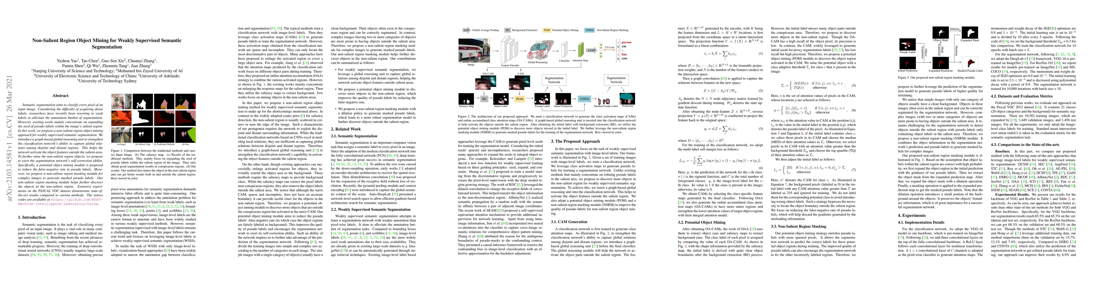 This paper introduces a novel non-salient region object mining method for weakly supervised semantic segmentation, utilizing a graph-based global reasoning unit to identify objects outside salient areas. It also includes a potential object mining module and a non-salient region masking module to enhance pseudo label accuracy, achieving state-of-the-art results on the PASCAL VOC dataset.