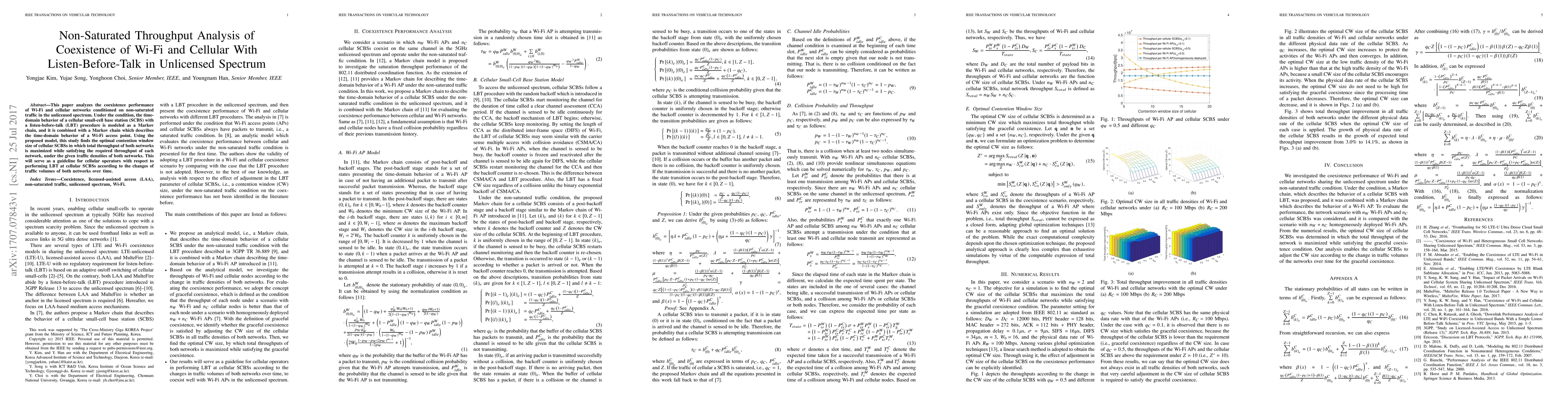 The paper presents a combined Markov chain model for time-domain behavior of cellular SCBSs with LBT and Wi-Fi access points, enabling non-saturated throughput analysis.