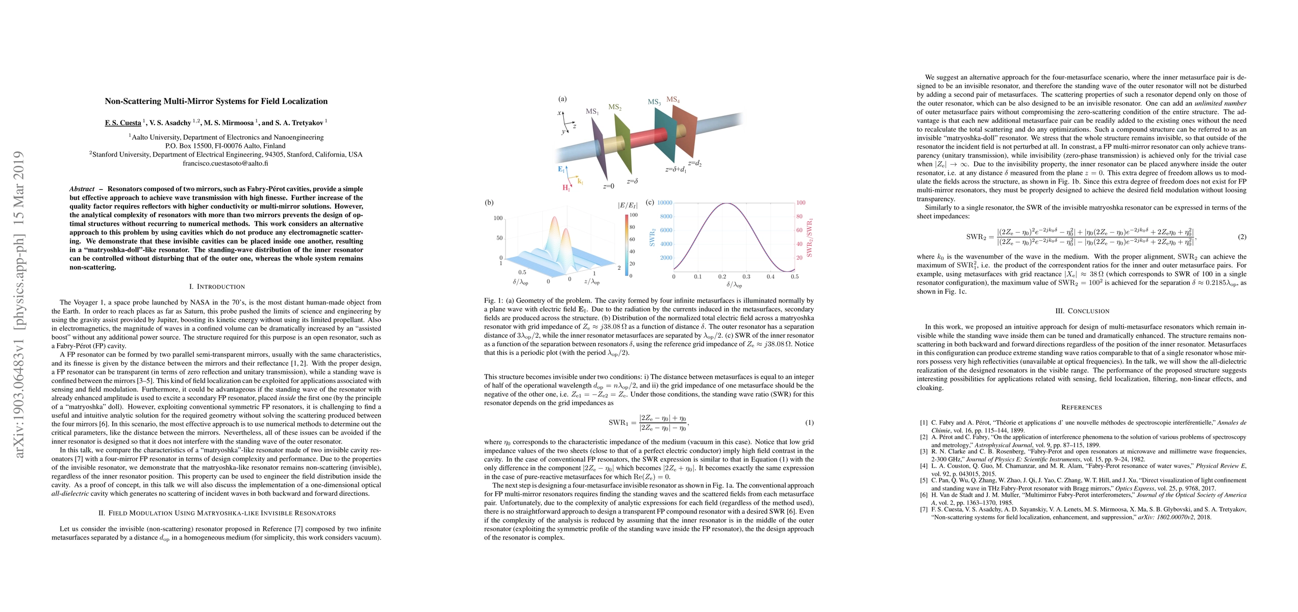 Resonators composed of two mirrors, such as Fabry-Perot cavities, provide a simple but effective approach to achieve wave transmission with high finesse. Further increase of the quality factor requires reflectors with higher conductivity or multi-mirror solutions. However, the analytical complexity of resonators with more than two mirrors prevents the design of optimal structures without recurring to numerical methods. This work considers an alternative approach to this problem by using cavities which do not produce any electromagnetic scattering. We demonstrate that these invisible cavities can be placed inside one another, resulting in a `matryoshka-doll'-like resonator. The standing-wave distribution of the inner resonator can be controlled without disturbing that of the outer one, whereas the whole system remains non-scattering.