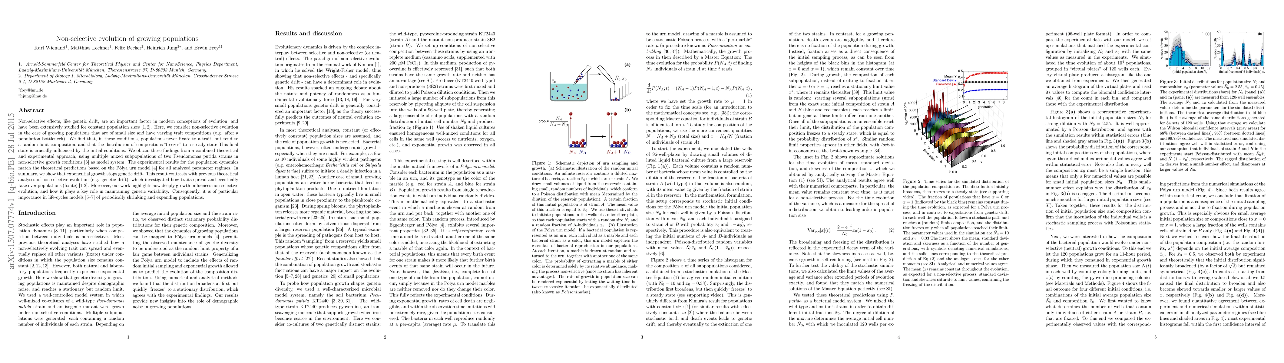 This study explores non-selective evolution in growing populations, demonstrating that such populations do not fixate on a single trait but reach a random limit composition. The research combines theoretical and experimental methods, showing that exponential growth halts genetic drift and maintains genetic variability, contrasting with previous studies focusing on trait fixation.