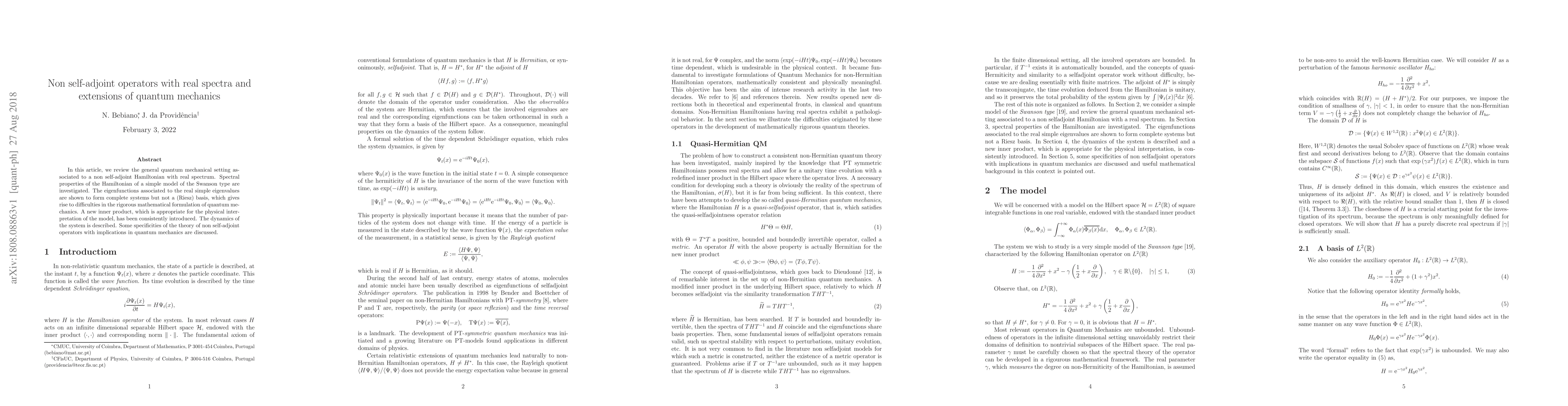 This paper reviews quantum mechanics with non self-adjoint Hamiltonians having real spectra, focusing on a Swanson-type model. It introduces a new inner product suitable for the physical interpretation, while discussing the dynamics and implications of non self-adjoint operators in quantum mechanics.