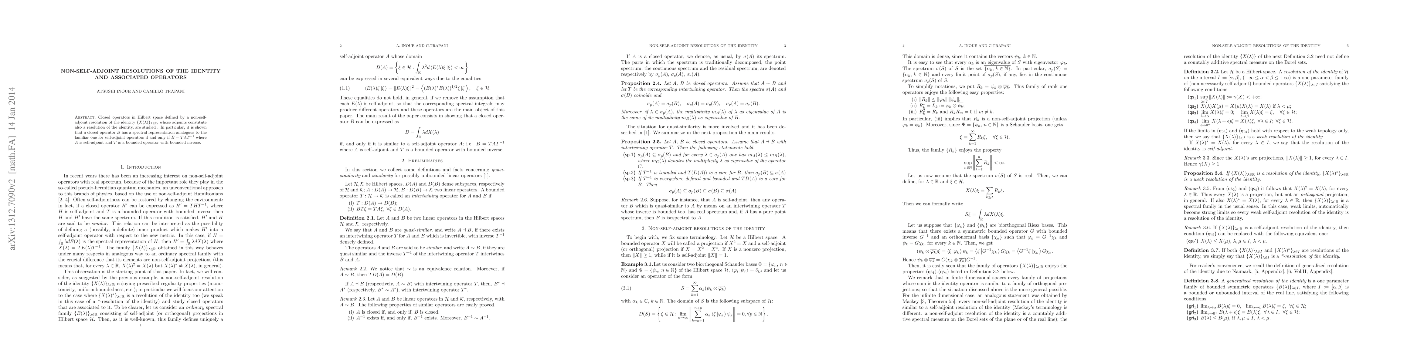 This paper investigates closed operators in Hilbert space derived from a non-self-adjoint resolution of the identity, demonstrating that such operators can be spectrally represented similarly to self-adjoint operators if they are expressed as $B = TAT^{-1}$, where $A$ is self-adjoint and $T$ is a bounded operator with a bounded inverse.