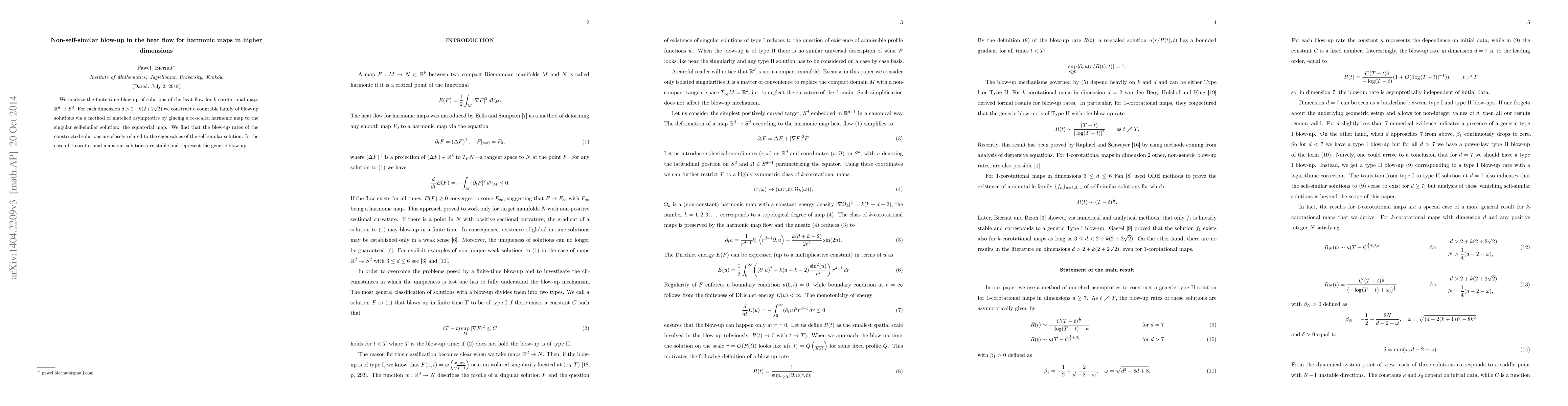 This paper investigates the finite-time blow-up behavior of heat flow solutions for $k$-corotational harmonic maps from $\mathbb{R}^d$ to $S^d$. The authors construct a countable family of non-self-similar blow-up solutions in dimensions $d > 2+k(2+2\sqrt{2})$, revealing that blow-up rates are linked to the eigenvalues of the singular self-similar equatorial map. For $1$-corotational maps, these solutions are stable and typical of generic blow-up.
