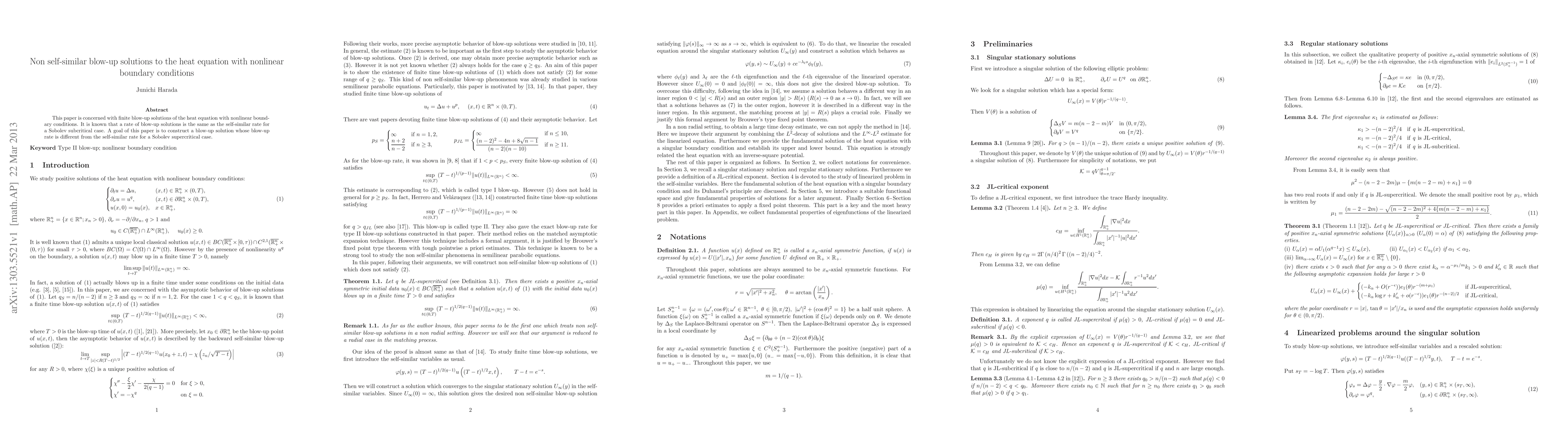This paper constructs finite blow-up solutions to the heat equation with nonlinear boundary conditions, demonstrating a non-self-similar blow-up rate in the Sobolev supercritical case, differing from the standard self-similar rate observed in subcritical cases.