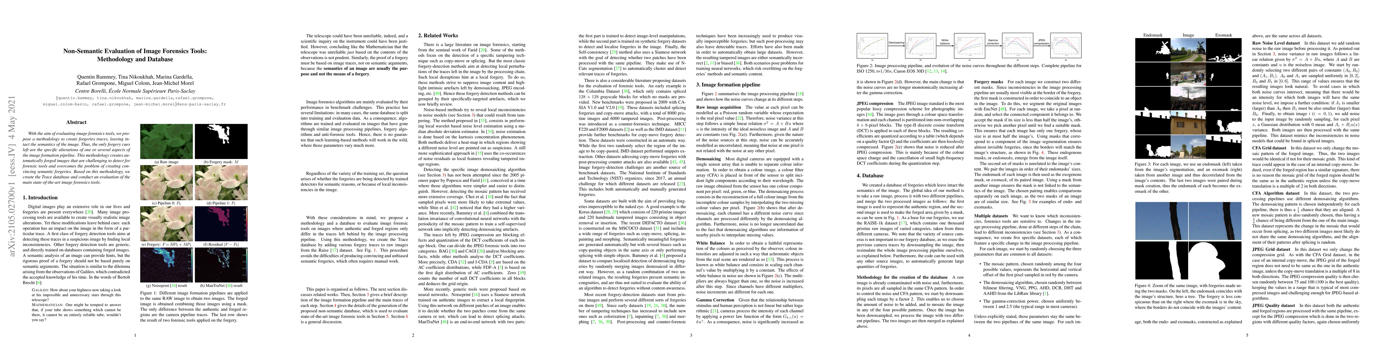 This paper proposes a methodology for creating non-semantic forgeries in images, focusing on altering specific image formation aspects without changing the image's semantics. It introduces the Trace database and evaluates state-of-the-art image forensics tools using this new approach.