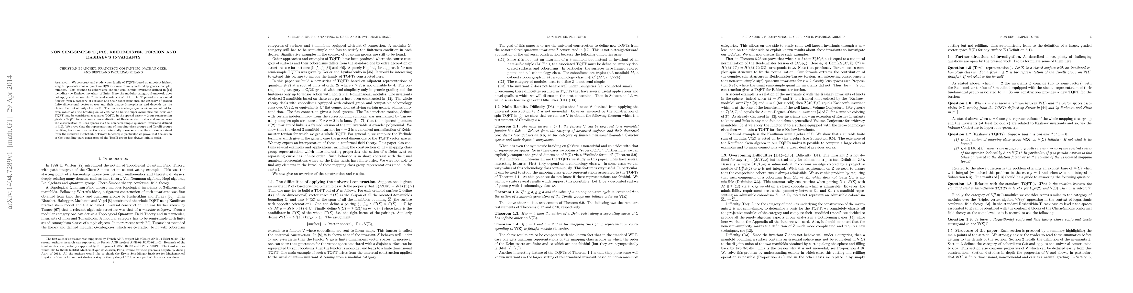 We construct and study a new family of TQFTs based on nilpotent highest weight representations of quantum sl(2) at a root of unity indexed by generic complex numbers. This extends to cobordisms the non-semi-simple invariants defined in (arXiv:1202.3553) including the Kashaev invariant of links. Here the modular category framework does not apply and we use the ``universal construction''. Our TQFT provides a monoidal functor from a category of surfaces and their cobordisms into the category of graded finite dimensional vector spaces and their degree 0-morphisms and depends on the choice of a root of unity of order 2r. The functor is always symmetric monoidal but for even values of r the braiding on GrVect has to be the super-symmetric one, thus our TQFT may be considered as a super-TQFT. In the special case r=2 our construction yields a TQFT for a canonical normalization of Reidemeister torsion and we re-prove the classification of Lens spaces via the non-semi-simple quantum invariants defined in (arXiv:1202.3553). We prove that the representations of mapping class groups and Torelli groups resulting from our constructions are potentially more sensitive than those obtained from the standard Reshetikhin-Turaev functors; in particular we prove that the action of the bounding pairs generators of the Torelli group has always infinite order.