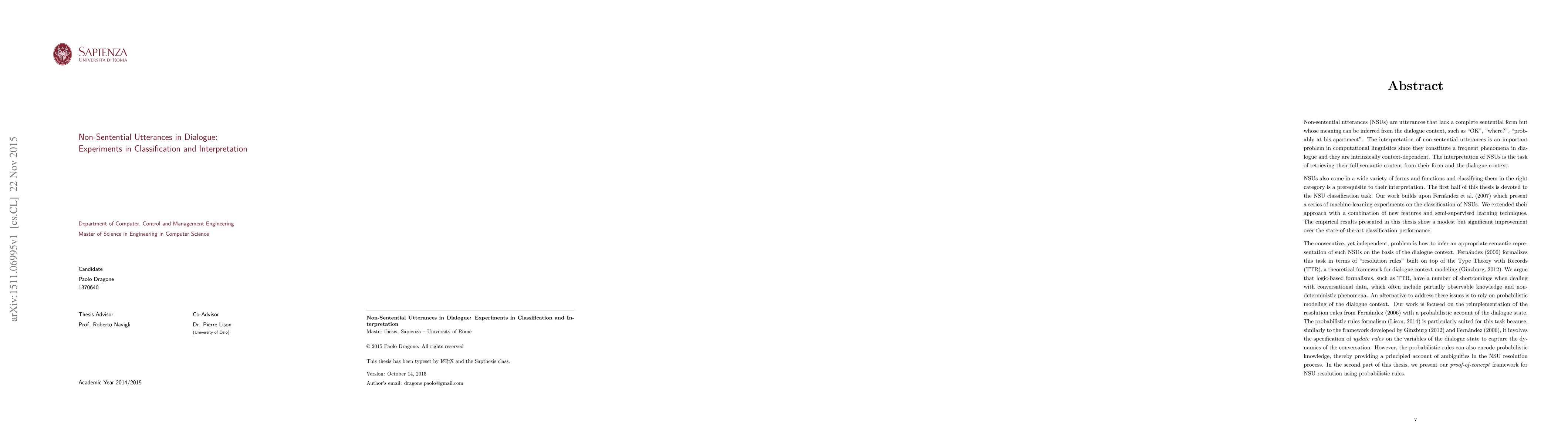 Non-sentential utterances (NSUs) are utterances that lack a complete sentential form but whose meaning can be inferred from the dialogue context, such as "OK", "where?", "probably at his apartment". The interpretation of non-sentential utterances is an important problem in computational linguistics since they constitute a frequent phenomena in dialogue and they are intrinsically context-dependent. The interpretation of NSUs is the task of retrieving their full semantic content from their form and the dialogue context. The first half of this thesis is devoted to the NSU classification task. Our work builds upon Fern\'andez et al. (2007) which present a series of machine-learning experiments on the classification of NSUs. We extended their approach with a combination of new features and semi-supervised learning techniques. The empirical results presented in this thesis show a modest but significant improvement over the state-of-the-art classification performance. The consecutive, yet independent, problem is how to infer an appropriate semantic representation of such NSUs on the basis of the dialogue context. Fern\'andez (2006) formalizes this task in terms of "resolution rules" built on top of the Type Theory with Records (TTR). Our work is focused on the reimplementation of the resolution rules from Fern\'andez (2006) with a probabilistic account of the dialogue state. The probabilistic rules formalism Lison (2014) is particularly suited for this task because, similarly to the framework developed by Ginzburg (2012) and Fern\'andez (2006), it involves the specification of update rules on the variables of the dialogue state to capture the dynamics of the conversation. However, the probabilistic rules can also encode probabilistic knowledge, thereby providing a principled account of ambiguities in the NSU resolution process.