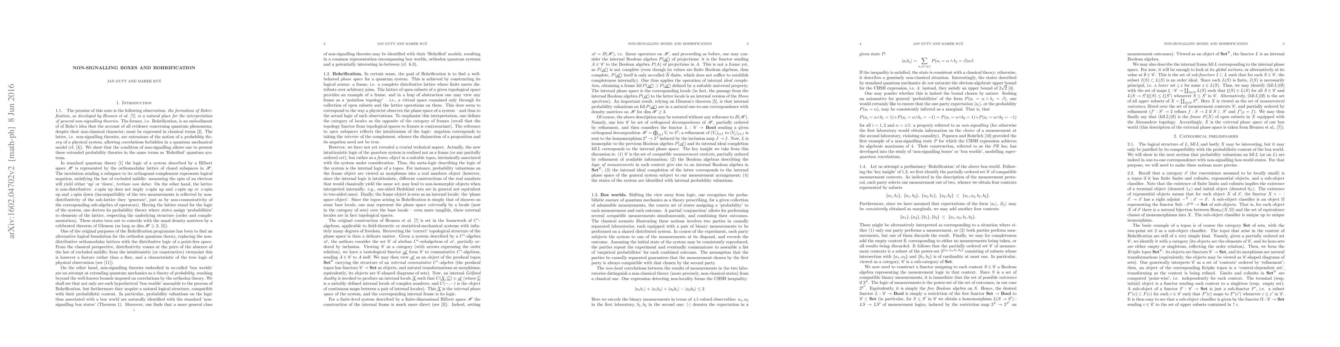 The paper introduces a novel method for interpreting non-signalling theories using Bohrification, demonstrating that non-signalling box-world states correspond to internal probability valuations in associated Kripke topoi.