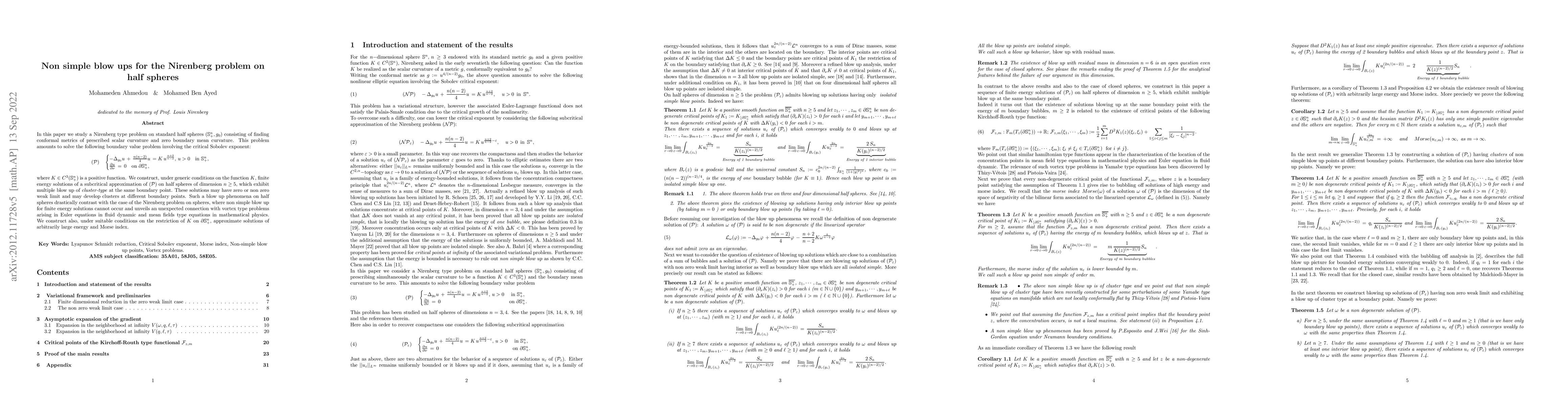 This paper investigates the Nirenberg problem on standard half spheres, focusing on finding conformal metrics with prescribed scalar curvature and zero boundary mean curvature. It constructs finite energy solutions exhibiting multiple "cluster-type" blow ups at the boundary, contrasting with the simpler blow up phenomena on full spheres and revealing connections to vortex problems in fluid dynamics and mean field equations in physics.