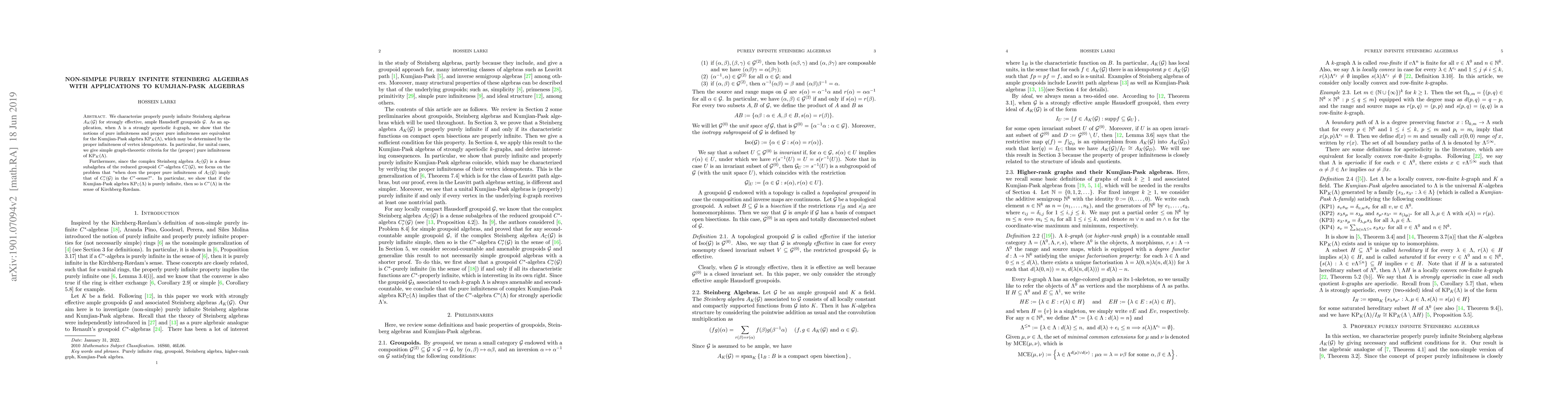 In this paper, we characterize properly purely infinite Steinberg algebras $A_K(\mathcal{G})$ for strongly effective, ample Hausdorff groupoids $\mathcal{G}$. As an application, when $\Lambda$ is a strongly aperiodic $k$-graph, we show that the notions of pure infiniteness and proper pure infiniteness are equivalent for the Kumjian-Pask algebra $\text{KP}_K(\Lambda)$, which may be determined by the proper infiniteness of vertex idempotents. In particular, for unital cases, we give simple graph-theoretic criteria for the (proper) pure infiniteness of $\text{KP}_K(\Lambda)$. Furthermore, since the complex Steinberg algebra $A_\mathbb{C}(\mathcal{G})$ is a dense subalgebra of the reduced groupoid $C^*$-algebra $C^*_r(\mathcal{G})$, we focus on the problem that "when does the proper pure infiniteness of $A_\mathbb{C}(\mathcal{G})$ imply that of $C^*_r(\mathcal{G})$ in the $C^*$-sense?". In particular, we show that if the Kumjian-Pask algebra $\mathrm{KP}_{\mathbb{C}}(\Lambda)$ is purely infinite, then so is $C^*(\Lambda)$ in the sense of Kirchberg-R{\o}rdam.