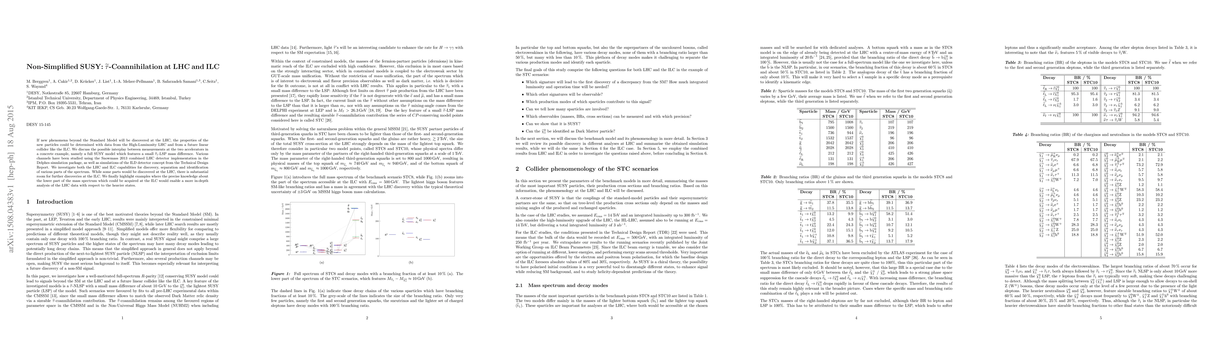 This paper explores the interplay between the LHC and ILC in determining properties of new particles beyond the Standard Model, focusing on a full SUSY model with a small stau-LSP mass difference. It highlights how the ILC can provide deeper insights into the lower mass spectrum, enhancing the analysis of heavier states discovered at the LHC.