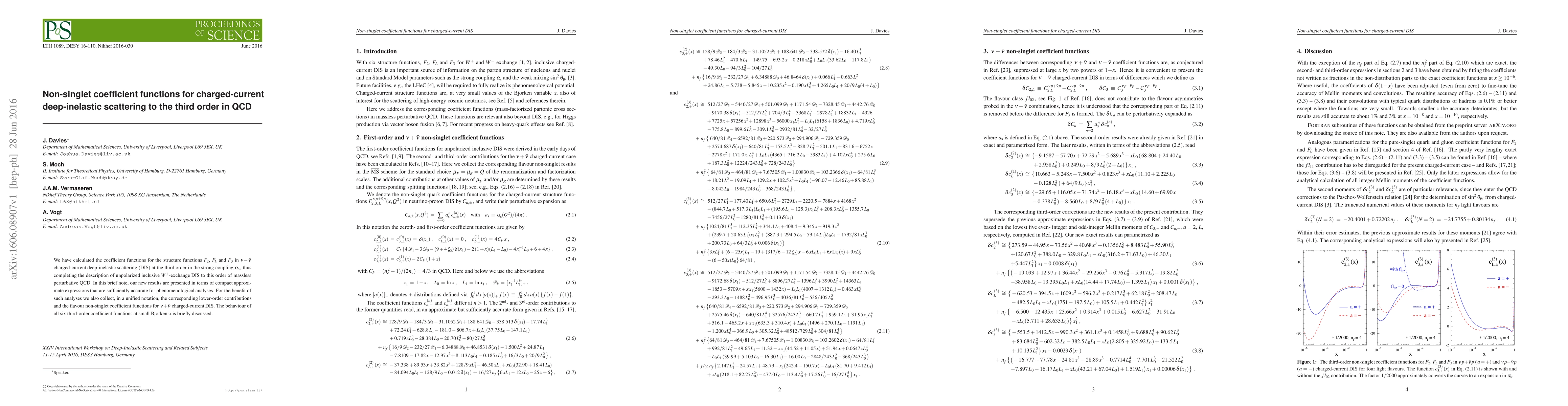 We have calculated the coefficient functions for the structure functions F_2, F_L and F_3 in nu-nubar charged-current deep-inelastic scattering (DIS) at the third order in the strong coupling alpha_s, thus completing the description of unpolarized inclusive W^(+-) exchange DIS to this order of massless perturbative QCD. In this brief note, our new results are presented in terms of compact approximate expressions that are sufficiently accurate for phenomenological analyses. For the benefit of such analyses we also collect, in a unified notation, the corresponding lower-order contributions and the flavour non-singlet coefficient functions for nu+nubar charged-current DIS. The behaviour of all six third-order coefficient functions at small Bjorken-x is briefly discussed.