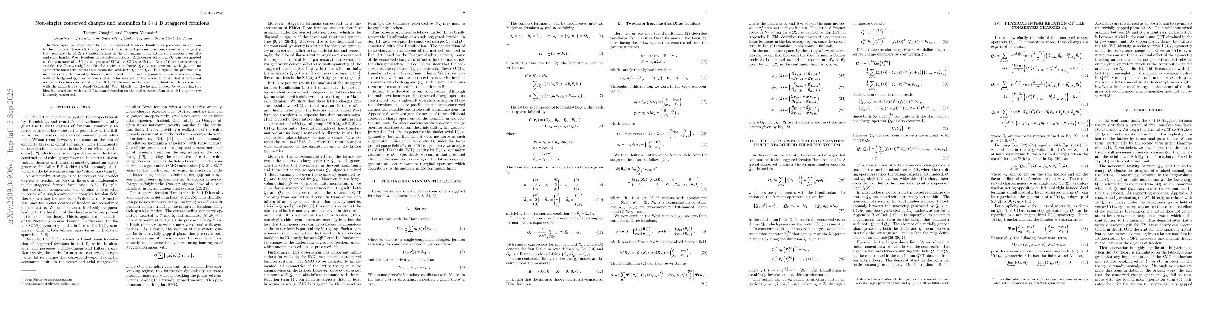 In this paper, we show that the 3+1 D staggered fermion Hamiltonian possesses, in addition to the conserved charge $Q_0$ that generates the vector $\mathrm{U}(1)_V$ transformation, conserved charges $Q_F$ that generate the $\mathrm{SU}(2)_A$ transformations in the continuum limit, acting simultaneously on left- and right-handed Weyl fermions in opposite directions. Each conserved charge $Q_F$ can be regarded as the generator of a $\mathrm{U}(1)_F$ subgroup of $\mathrm{SU}(2)_L \times \mathrm{SU}(2)_R \times \mathrm{U}(1)_A$. One of these lattice charges satisfies the Onsager algebra. On the lattice, the charges $Q_F$ do not commute with $Q_0$, and no symmetric mass term exists that commutes with both $Q_0$ and $Q_F$. This signals the presence of a mixed anomaly. Remarkably, however, in the continuum limit, a symmetric mass term commuting with both $Q_0$ and $Q_F$ can be constructed. % This implies that the non-trivial lattice anomaly becomes a trivial anomaly in the continuum QFT. This means that the mixed anomaly that is nontrivial on the lattice becomes trivial in the IR QFT obtained in the continuum limit, which is consistent with the analysis of the Ward--Takahashi (WT) identity on the lattice. Indeed, by evaluating this identity associated with the $\mathrm{U}(1)_F$ transformation on the lattice, we confirm that $\mathrm{U}(1)_F$ symmetry is exactly conserved.