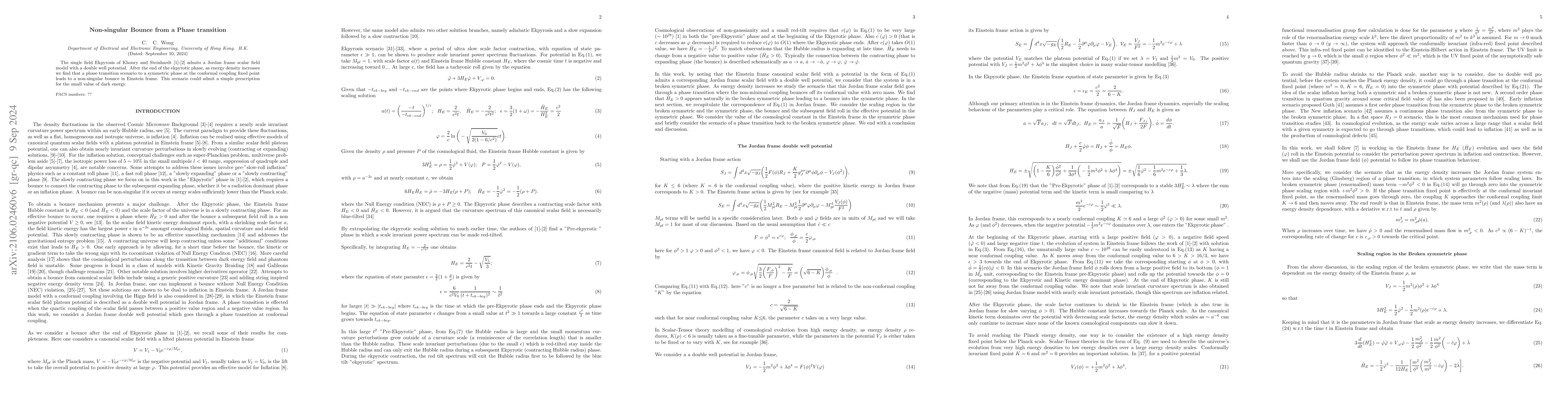 This paper explores the Ekpyrotic phase transitioning to a symmetric phase via a conformal coupling fixed point, resulting in a non-singular bounce in the Einstein frame, using a single field with a double well potential. The transition avoids singularities, providing a smooth cosmological evolution.