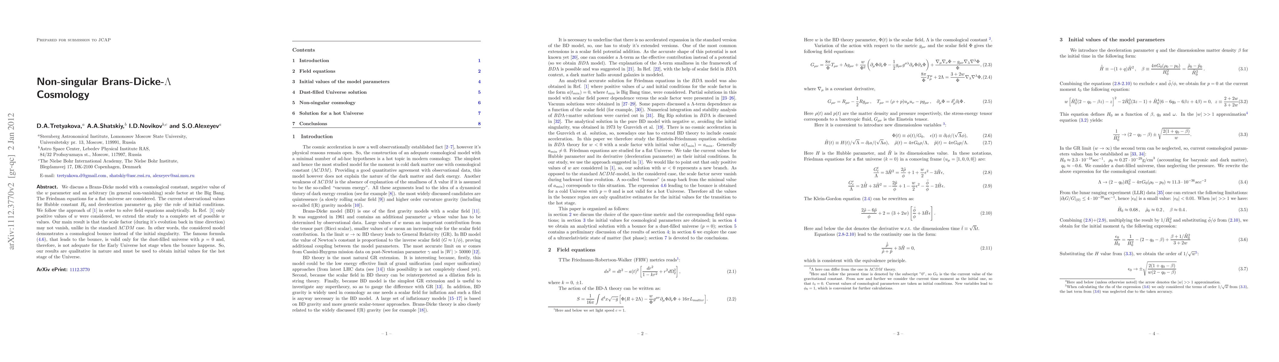 We consider Brans-Dicke cosmology with cosmological constant with negative w parameter and an arbitrary (in general non-vanishing) scale factor at the Big Bang. The field equations describe the flat universe, current observational values for Hubble constant H and deceleration parameter q play a role of initial conditions. In order to solve field equations we adopt the approach of Uehara and Kim (1982). They considered only positive values of w, hence our solution is a new one and has not been described in their paper. Our main result is that unlike the standard cosmology the scale factor may not vanish in it's evolution back in time. In other words our model displays a cosmological bounce and avoids the initial singularity. The formula for the scale factor, leading to the bounce, is only valid for the dust-filled universe and hence cannot be adequate for the hot stage in the early universe when the bounce happens. So, the results of this paper are only qualitative in nature and must be used to obtain initial values for the hot stage of the unverse when one considers the evolution back in time.