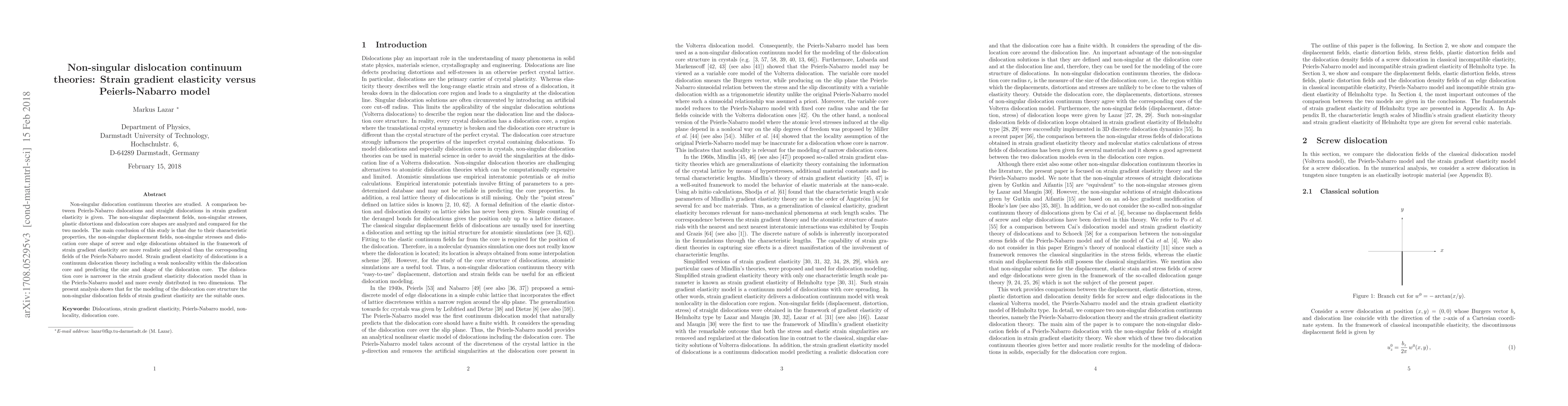 This paper compares non-singular dislocation continuum theories, specifically strain gradient elasticity and the Peierls-Nabarro model, finding that the former provides more realistic and physical non-singular displacement fields, stresses, and dislocation core shapes, with a narrower and more evenly distributed core.
