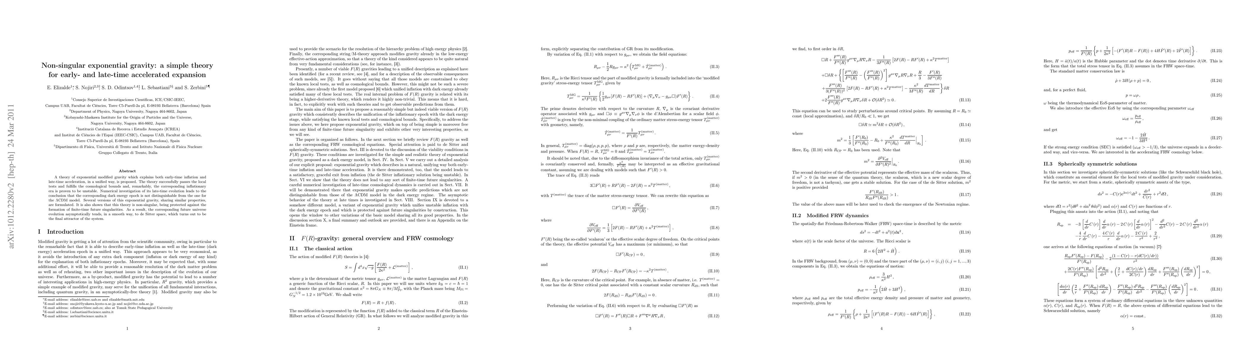 This paper proposes a non-singular exponential gravity theory that unifies early-time inflation and late-time accelerated expansion, passing local tests and cosmological bounds. It predicts a smooth asymptotic evolution towards de Sitter space, avoiding future singularities.