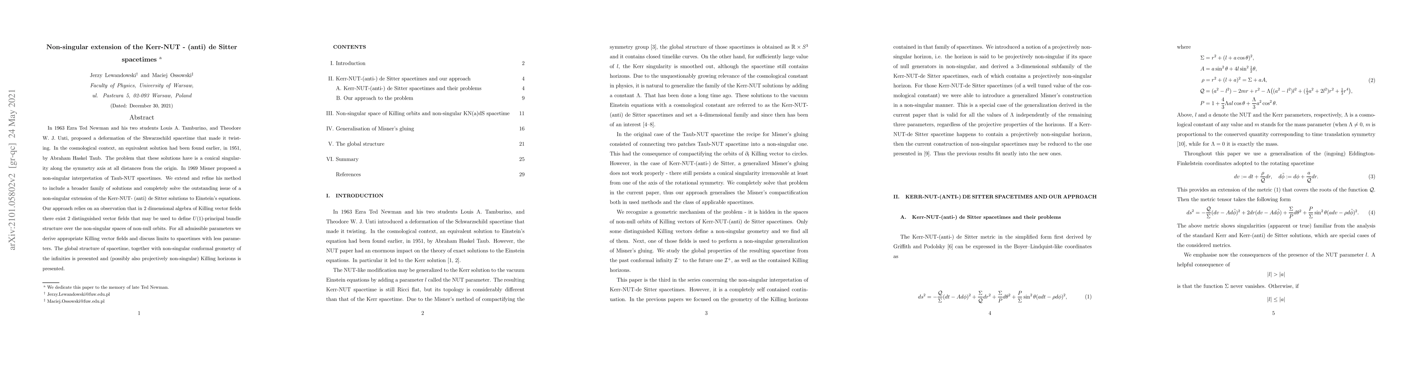In 1963 Ezra Ted Newman and his two students Louis A. Tamburino, and Theodore W. J. Unti, proposed a deformation of the Shwarzschild spacetime that made it twisting. In the cosmological context, an equivalent solution had been found earlier, in 1951, by Abraham Haskel Taub. The problem that these solutions have is a conical singularity along the symmetry axis at all distances from the origin. In 1969 Misner proposed a non-singular interpretation of Taub-NUT spacetimes. We extend and refine his method to include a broader family of solutions and completely solve the outstanding issue of a non-singular extension of the Kerr-NUT- (anti) de Sitter solutions to Einstein's equations. Our approach relies on an observation that in 2 dimensional algebra of Killing vector fields there exist 2 distinguished vector fields that may be used to define $U(1)$-principal bundle structure over the non-singular spaces of non-null orbits. For all admissible parameters we derive appropriate Killing vector fields and discuss limits to spacetimes with less parameters. The global structure of spacetime, together with non-singular conformal geometry of the infinities is presented and (possibly also projectively non-singular) Killing horizons is presented.