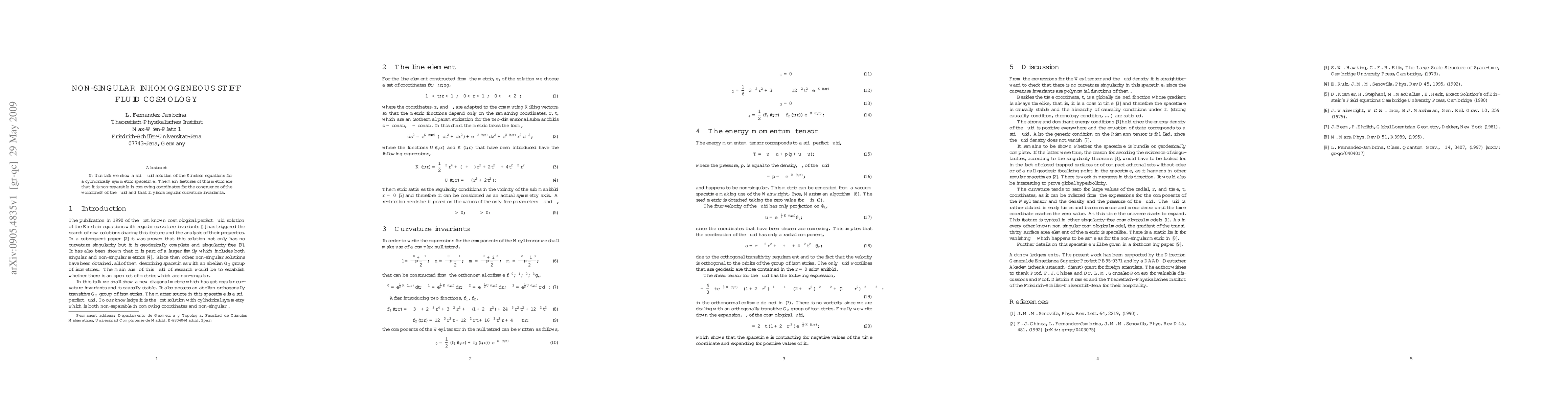 In this talk we show a stiff fluid solution of the Einstein equations for a cylindrically symmetric spacetime. The main features of this metric are that it is non-separable in comoving coordinates for the congruence of the worldlineS of the fluid and that it yields regular curvature invariants.