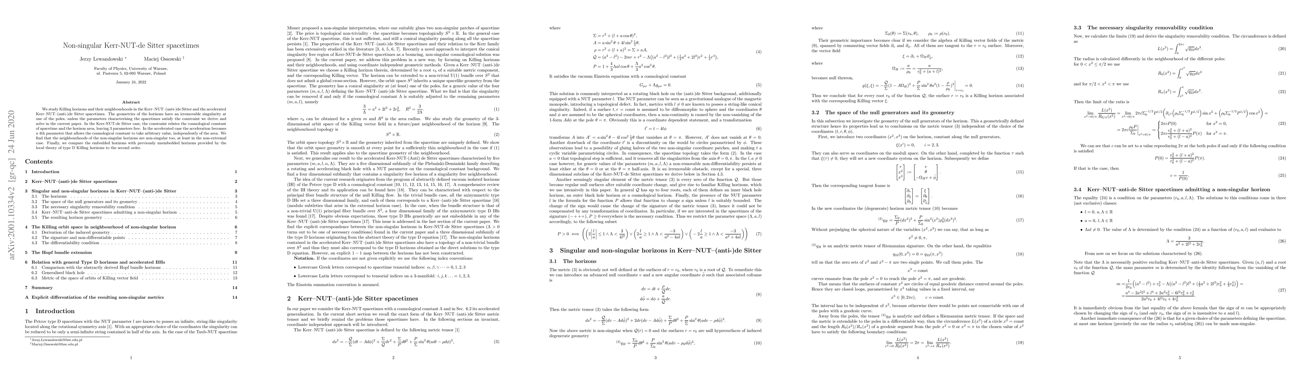 We study Killing horizons and their neighbourhoods in the Kerr-NUT-(anti-)de Sitter and the accelerated Kerr-NUT-(anti-)de Sitter spacetimes. The geometries of the horizons have an irremovable singularity at one of the poles, unless the parameters characterising the spacetimes satisfy the constraint we derive and solve in the current paper. In the Kerr-NUT-de Sitter case, the constraint relates the cosmological constant of spacetime and the horizon area, leaving 3 parameters free. In the accelerated case the acceleration becomes a 4th parameter that allows the cosmological constant to take arbitrary value, independently of the area. We find that the neighbourhoods of the non-singular horizons are non-singular too, at least in the non-extremal case. Finally, we compare the embedded horizons with previously unembedded horizons provided by the local theory of type D Killing horizons to the second order.