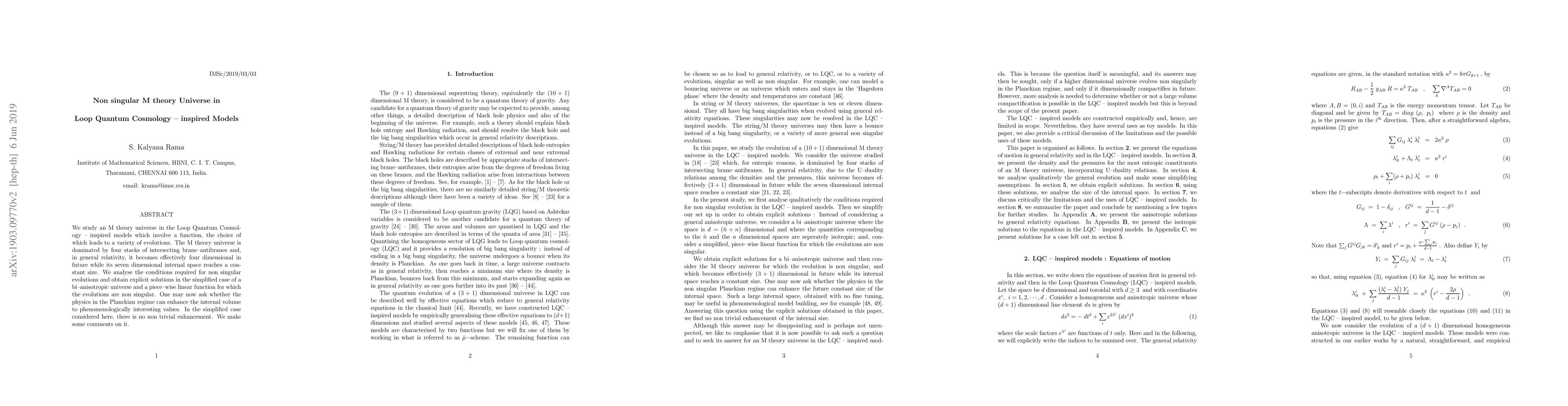 We study an M theory universe in the Loop Quantum Cosmology -- inspired models which involve a function, the choice of which leads to a variety of evolutions. The M theory universe is dominated by four stacks of intersecting brane--antibranes and, in general relativity, it becomes effectively four dimensional in future while its seven dimensional internal space reaches a constant size. We analyse the conditions required for non singular evolutions and obtain explicit solutions in the simplified case of a bi--anisotropic universe and a piece--wise linear function for which the evolutions are non singular. One may now ask whether the physics in the Planckian regime can enhance the internal volume to phenomenologically interesting values. In the simplified case considered here, there is no non trivial enhancement. We make some comments on it.