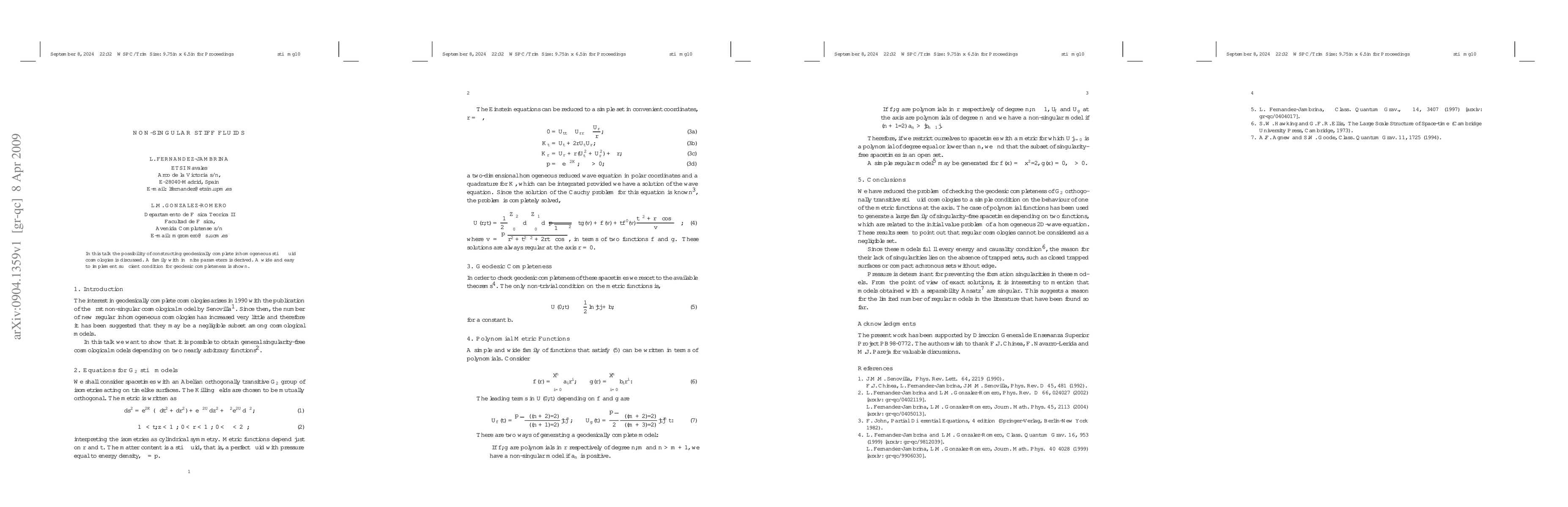 In this talk the possibility of constructing geodesically complete inhomogeneous stiff fluid cosmologies is discussed. A family with infinite parameters is derived. A wide and easy to implement sufficient condition for geodesic completeness is shown.