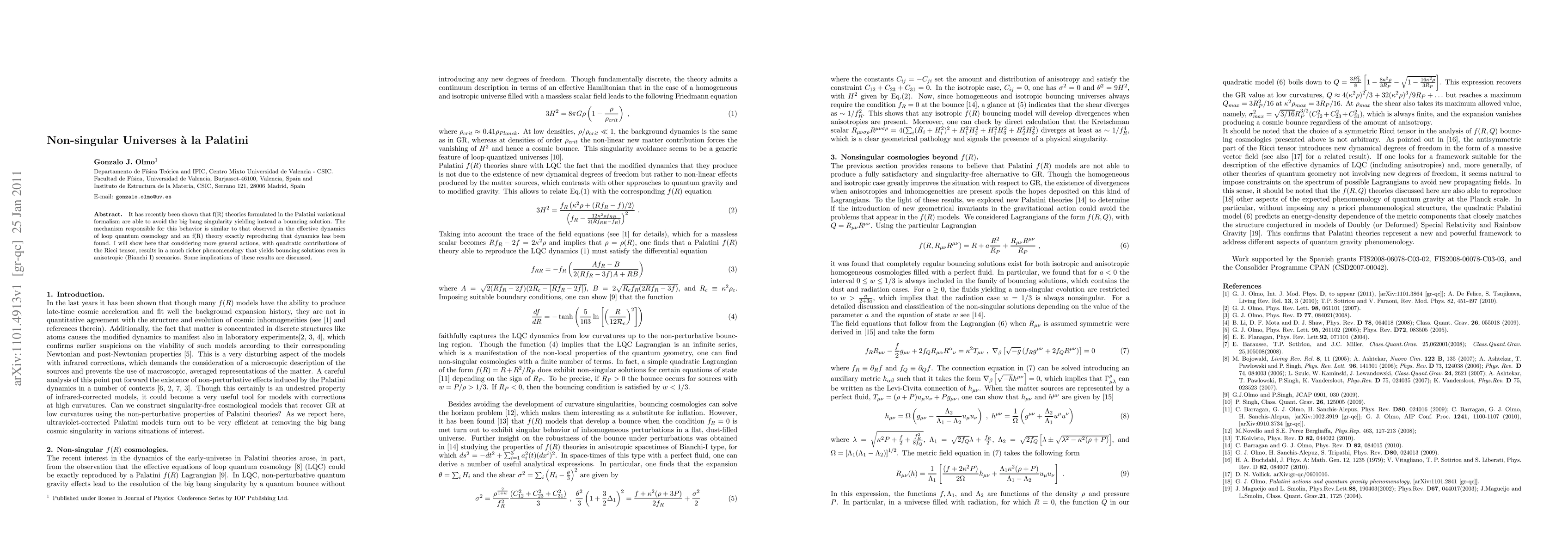 It has recently been shown that f(R) theories formulated in the Palatini variational formalism are able to avoid the big bang singularity yielding instead a bouncing solution. The mechanism responsible for this behavior is similar to that observed in the effective dynamics of loop quantum cosmology and an f(R) theory exactly reproducing that dynamics has been found. I will show here that considering more general actions, with quadratic contributions of the Ricci tensor, results in a much richer phenomenology that yields bouncing solutions even in anisotropic (Bianchi I) scenarios. Some implications of these results are discussed.