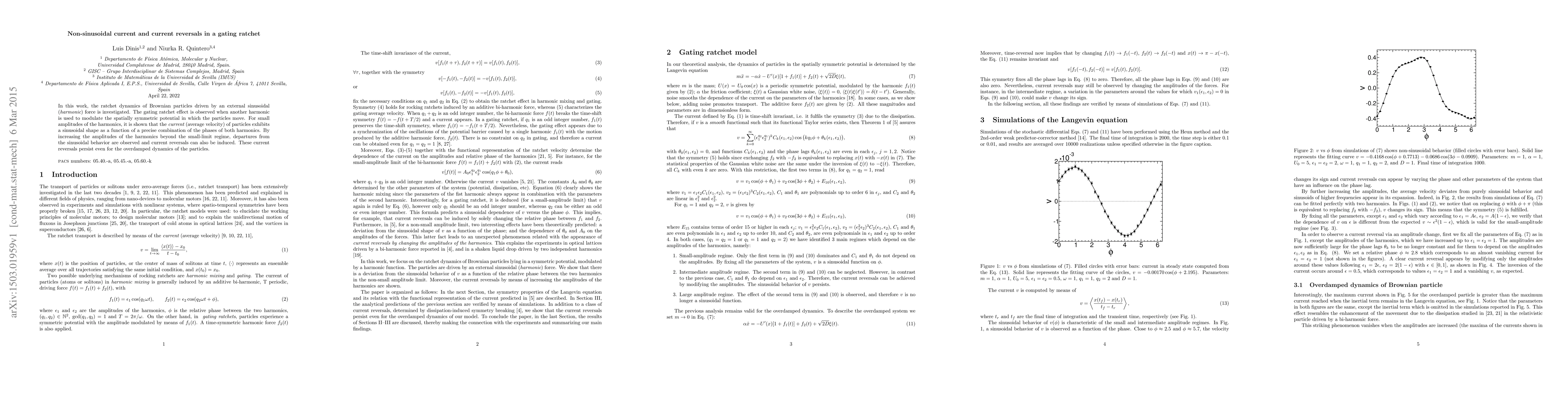 This research investigates the dynamics of Brownian particles in a gating ratchet system driven by sinusoidal forces, revealing that current reversals can occur when the modulation amplitudes exceed a small threshold, leading to non-sinusoidal current behavior even in overdamped conditions.
