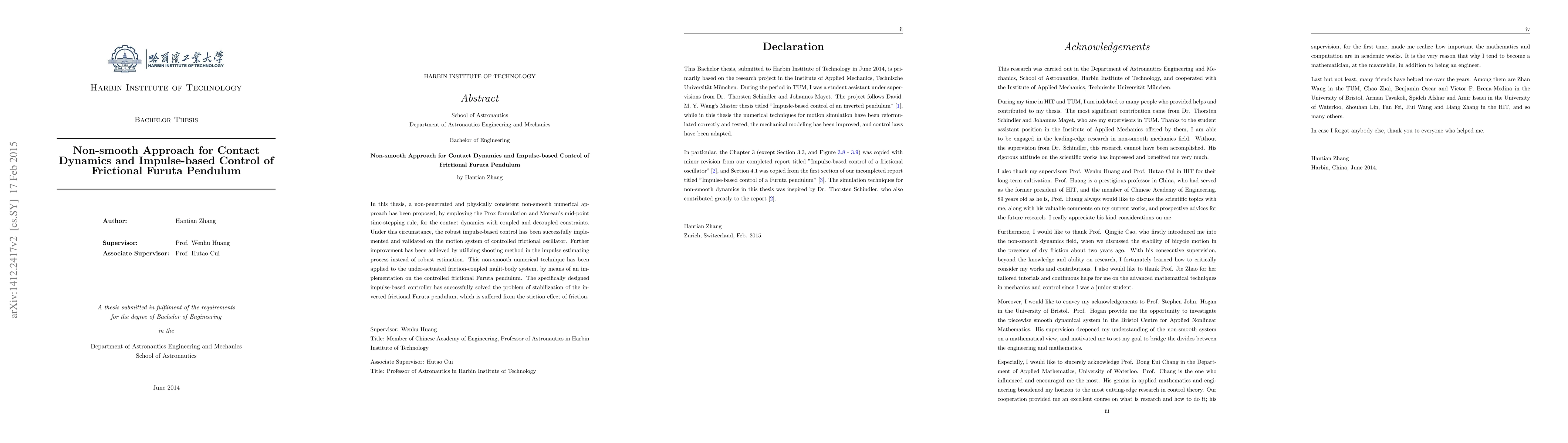 In this thesis, a non-penetrated and physically consistent non-smooth numerical approach has been proposed, by employing the Prox formulation and Moreau's mid-point time-stepping rule, for the contact dynamics with coupled and decoupled constraints. Under this circumstance, the robust impulse-based control has been successfully implemented and validated on the motion system of controlled frictional oscillator. Further improvement has been achieved by utilizing shooting method in the impulse estimating process instead of robust estimation. This non-smooth numerical technique has been applied to the under-actuated friction-coupled mulit-body system, by means of an implementation on the controlled frictional Furuta pendulum. The specifically designed impulse-based controller has successfully solved the problem of stabilization of the inverted frictional Furuta pendulum, which is suffered from the stiction effect of friction.