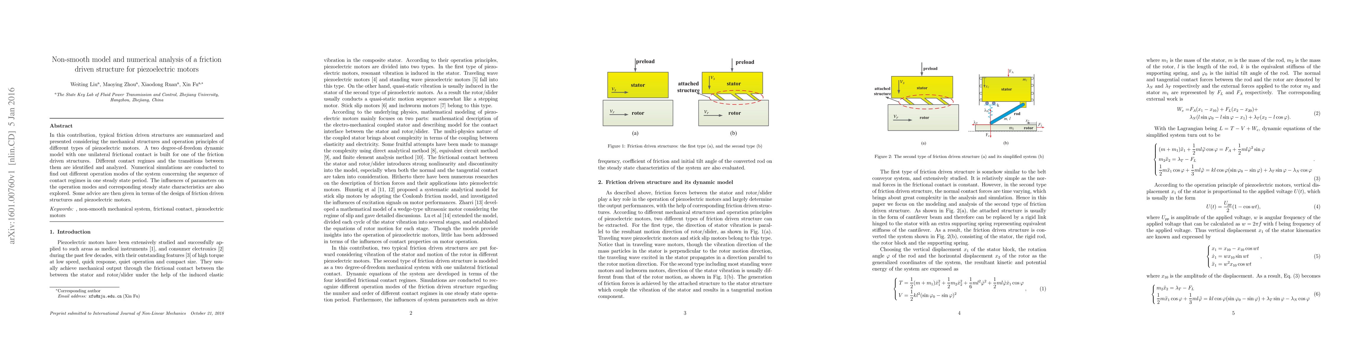 In this contribution, typical friction driven structures are summarized and presented considering the mechanical structures and operation principles of different types of piezoelectric motors. A two degree-of-freedom dynamic model with one unilateral frictional contact is built for one of the friction driven structures. Different contact regimes and the transitions between them are identified and analyzed. Numerical simulations are conducted to find out different operation modes of the system concerning the sequence of contact regimes in one steady state period. The influences of parameters on the operation modes and corresponding steady state characteristics are also explored. Some advice are then given in terms of the design of friction driven structures and piezoelectric motors.