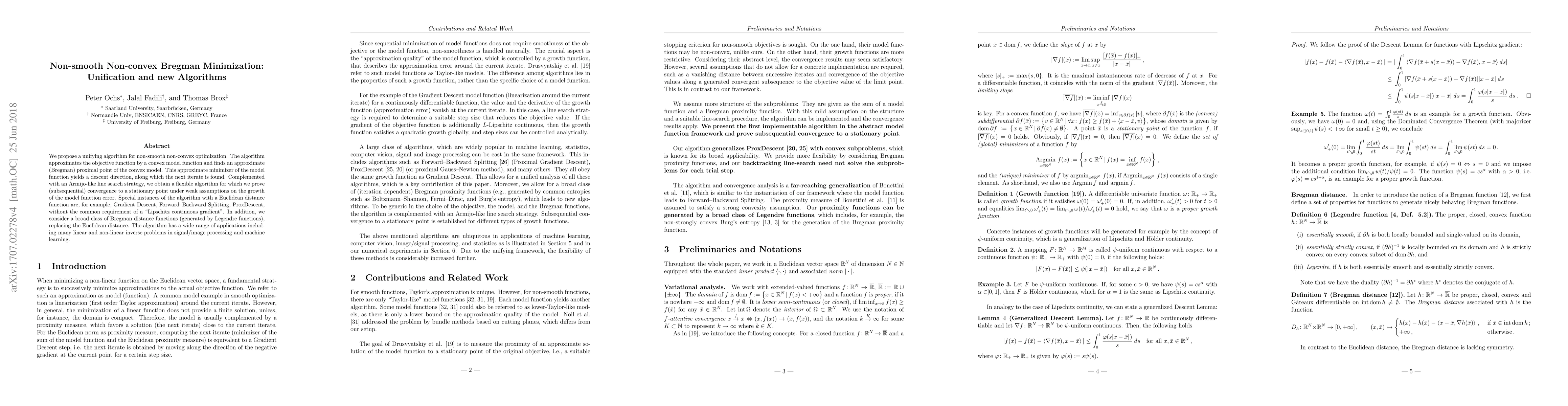 We propose a unifying algorithm for non-smooth non-convex optimization. The algorithm approximates the objective function by a convex model function and finds an approximate (Bregman) proximal point of the convex model. This approximate minimizer of the model function yields a descent direction, along which the next iterate is found. Complemented with an Armijo-like line search strategy, we obtain a flexible algorithm for which we prove (subsequential) convergence to a stationary point under weak assumptions on the growth of the model function error. Special instances of the algorithm with a Euclidean distance function are, for example, Gradient Descent, Forward--Backward Splitting, ProxDescent, without the common requirement of a "Lipschitz continuous gradient". In addition, we consider a broad class of Bregman distance functions (generated by Legendre functions) replacing the Euclidean distance. The algorithm has a wide range of applications including many linear and non-linear inverse problems in signal/image processing and machine learning.