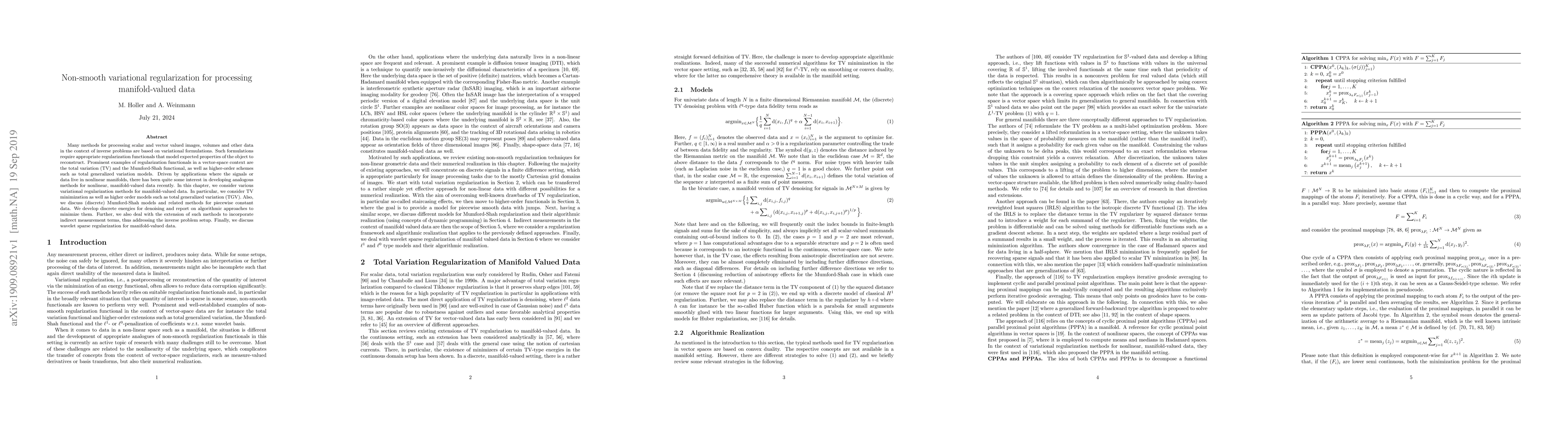 This paper explores variational regularization methods for processing manifold-valued data, focusing on total variation (TV) and total generalized variation (TGV) models, as well as discrete Mumford-Shah models. It develops discrete energies for denoising and discusses algorithmic approaches for minimizing these energies, extending the methods to address inverse problems.