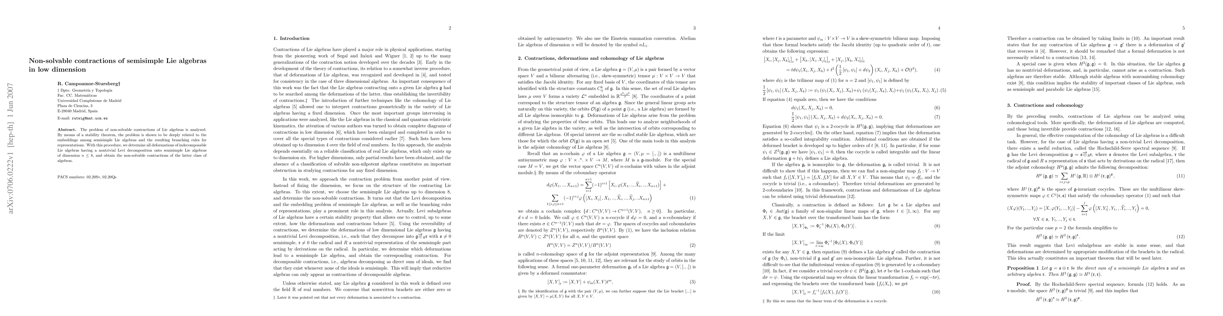 The paper explores non-solvable contractions in low-dimensional semisimple Lie algebras, revealing their connection to embeddings and branching rules for representations. It determines all deformations of indecomposable Lie algebras with nontrivial Levi decompositions onto semisimple Lie algebras of dimension ≤ 8, identifying their non-solvable contractions.