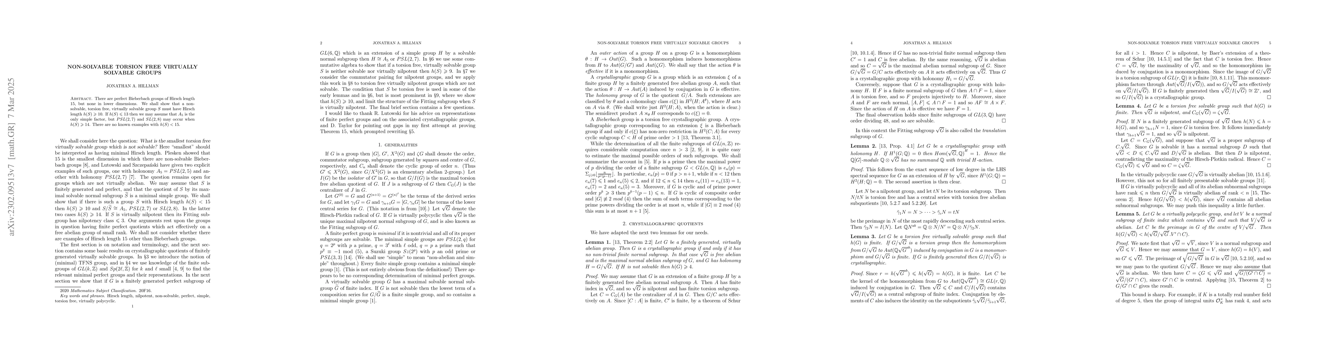 This paper demonstrates that a non-solvable, torsion-free, virtually solvable group with Hirsch length at least 10 has specific structural constraints; if the Hirsch length is less than 14, the only simple factor is $A_5$. For virtually nilpotent groups with a Hirsch length up to 14, the Fitting subgroup exhibits nilpotency class no greater than 3.