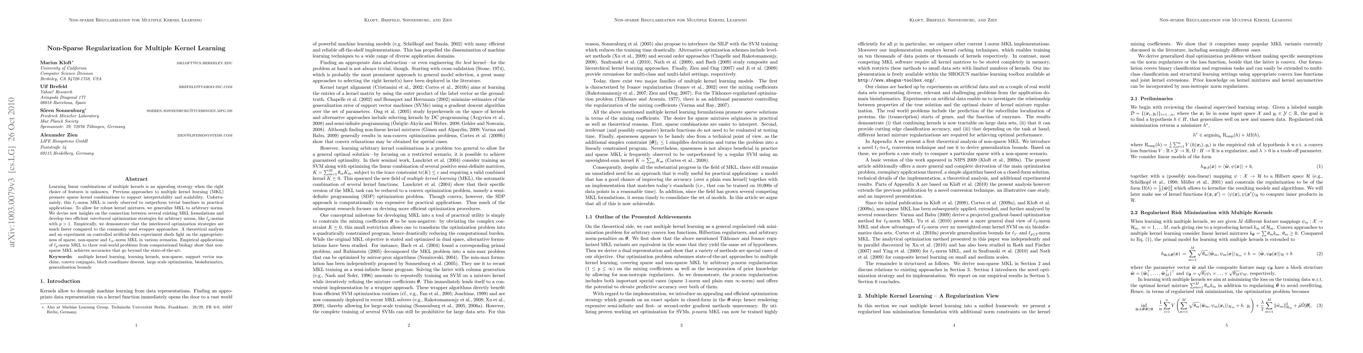 Learning linear combinations of multiple kernels is an appealing strategy when the right choice of features is unknown. Previous approaches to multiple kernel learning (MKL) promote sparse kernel combinations to support interpretability and scalability. Unfortunately, this 1-norm MKL is rarely observed to outperform trivial baselines in practical applications. To allow for robust kernel mixtures, we generalize MKL to arbitrary norms. We devise new insights on the connection between several existing MKL formulations and develop two efficient interleaved optimization strategies for arbitrary norms, like p-norms with p>1. Empirically, we demonstrate that the interleaved optimization strategies are much faster compared to the commonly used wrapper approaches. A theoretical analysis and an experiment on controlled artificial data experiment sheds light on the appropriateness of sparse, non-sparse and $\ell_\infty$-norm MKL in various scenarios. Empirical applications of p-norm MKL to three real-world problems from computational biology show that non-sparse MKL achieves accuracies that go beyond the state-of-the-art.