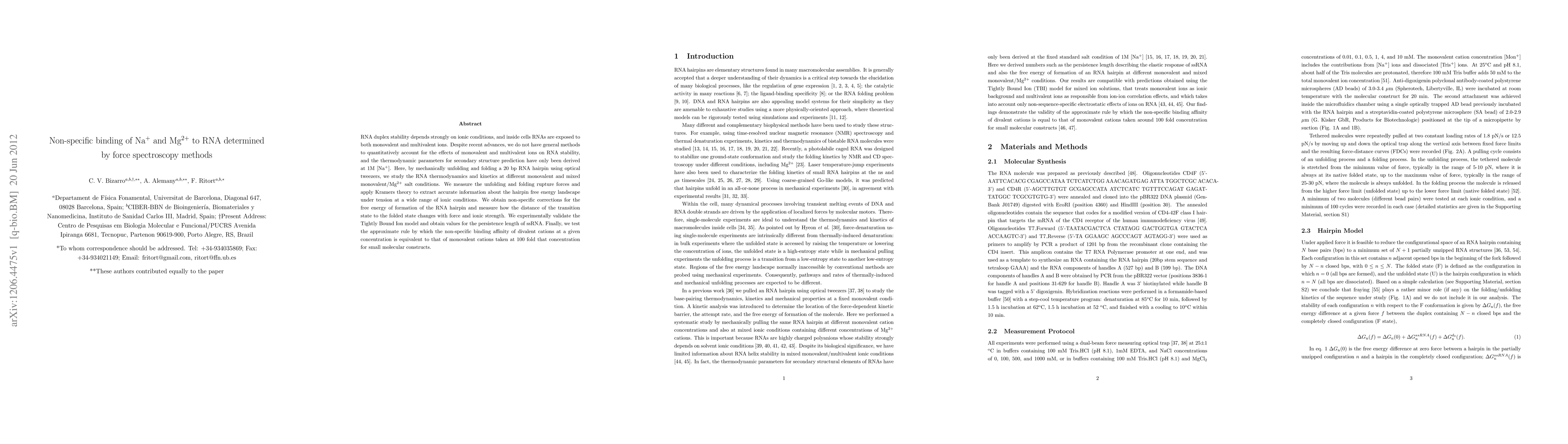 This paper uses optical tweezers to study the effect of Na$^+$ and Mg$^{2+}$ ions on RNA duplex stability through mechanical unfolding and folding experiments. The research provides quantitative insights into the non-specific binding of ions and validates the Tightly Bound Ion model, offering new thermodynamic parameters for RNA secondary structure prediction.