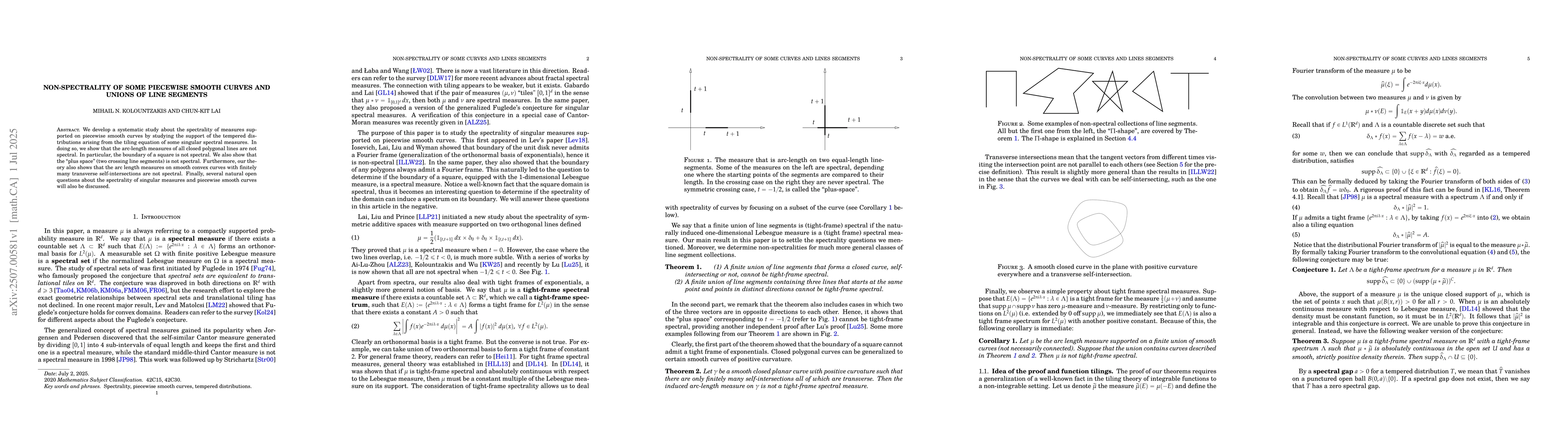 We develop a systematic study about the spectrality of measures supported on piecewise smooth curves by studying the support of the tempered distributions arising from the tiling equation of some singular spectral measures. In doing so, we show that the arc-length measures of all closed polygonal lines are not spectral. {In particular, the boundary of a square is not spectral. We also show that the ``plus space'' (two crossing line segments) is not spectral.} Furthermore, our theory also shows that the arc length measures on {smooth} convex curves with finitely many transverse self-intersections are not spectral. Finally, several natural open questions about the spectrality of singular measures and {piecewise} smooth curves will also be discussed.