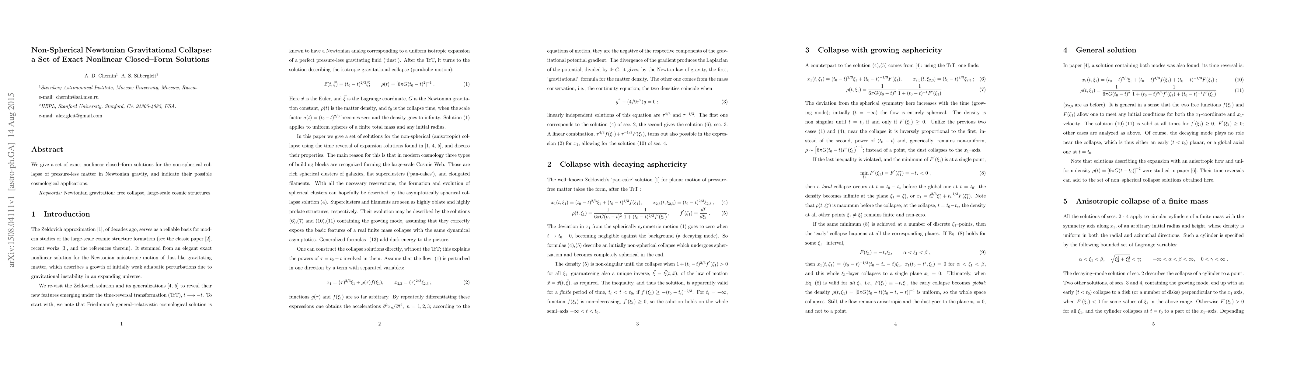 This paper presents exact nonlinear closed-form solutions for the non-spherical collapse of pressure-less matter under Newtonian gravity, with potential applications to understanding the formation of large-scale cosmic structures.